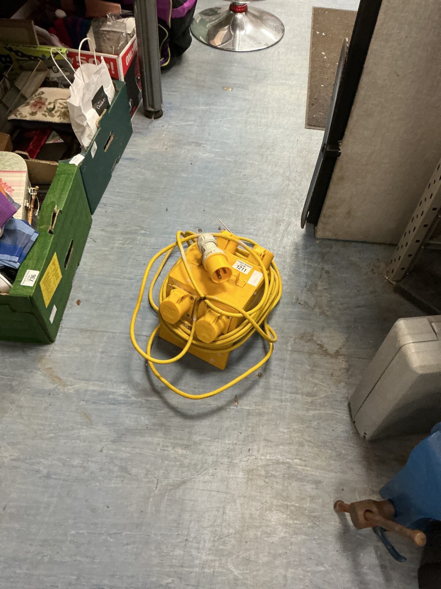 This is a yellow 110v connector box, designed for distributing electrical power on site. It features a robust plastic casing and a coiled cable for flexibility. The box appears to be designed for temporary power solutions, potentially for construction or event use.