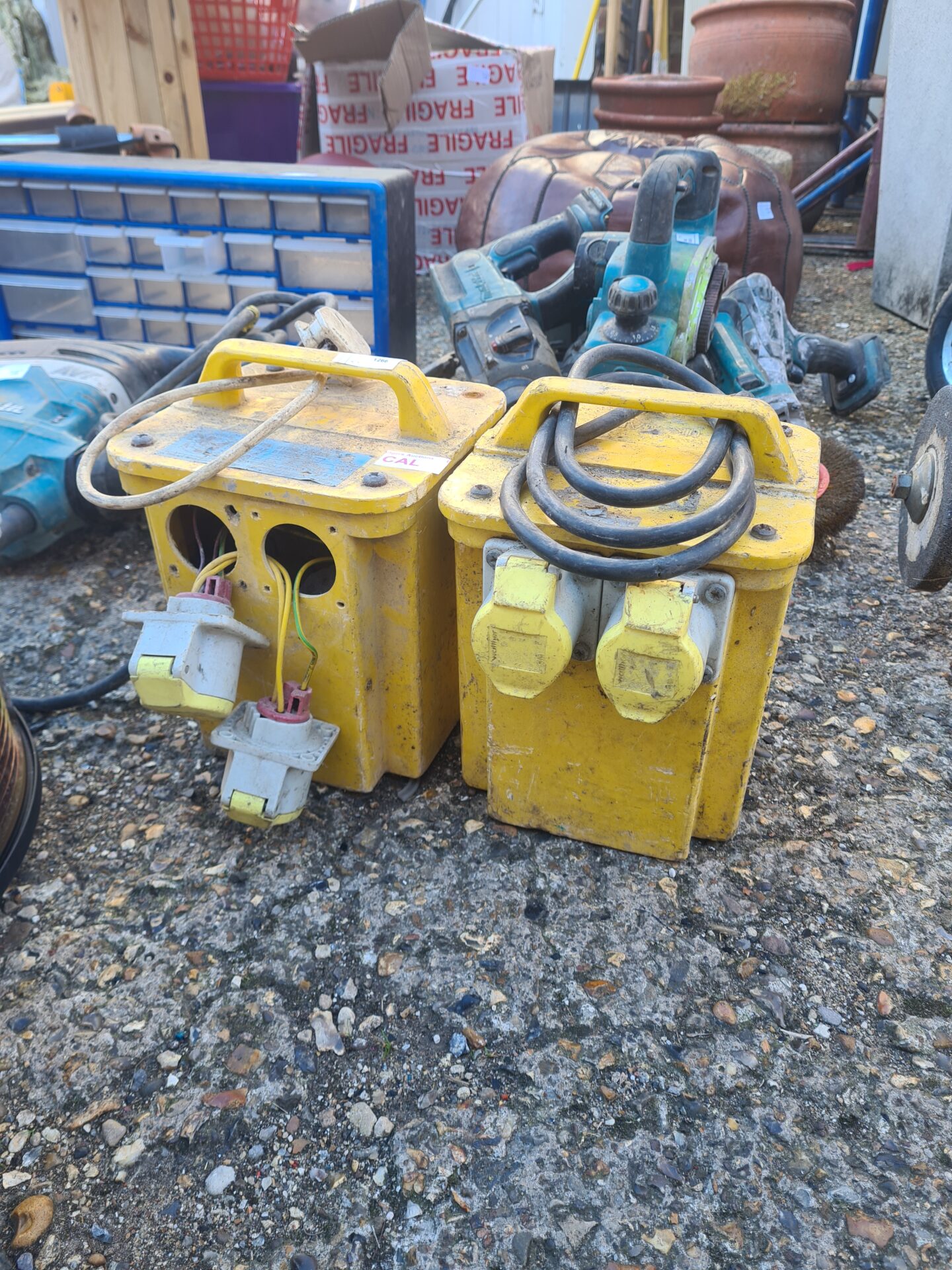 These are two robust industrial 110v transformer blocks, designed to step down voltage for various applications. Constructed from heavy-duty materials, these transformers are built to withstand demanding environments. They feature multiple outlets for connecting various tools or equipment, making them ideal for construction sites, workshops, or any location requiring a reliable power source.