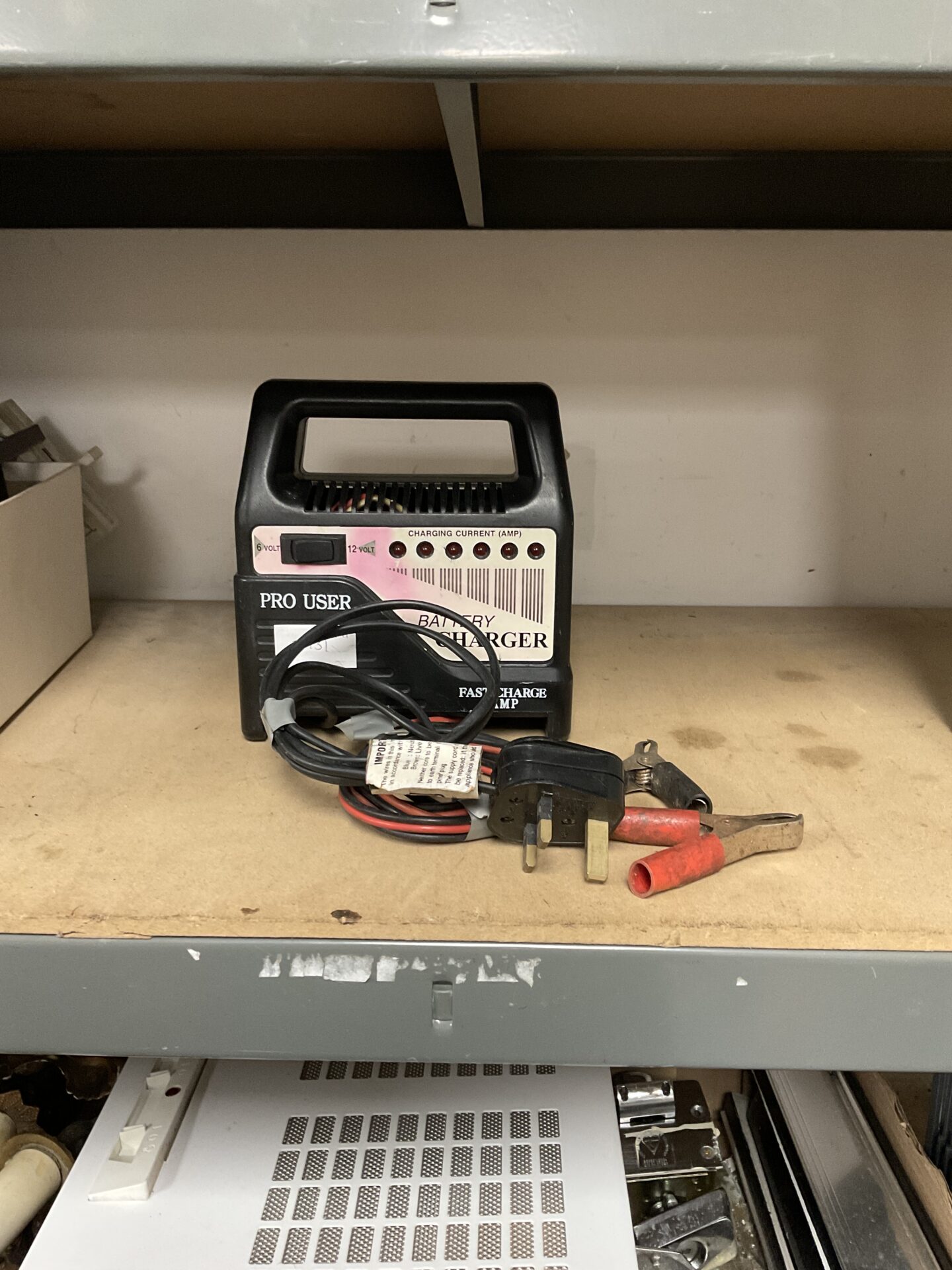 This is a 12v battery charger, designed for maintaining and charging lead-acid batteries. The charger features a robust construction and is intended for automotive or similar applications. It appears to have multiple charging rate settings, indicated by the ammeter display, allowing for adjustment based on battery size and condition.