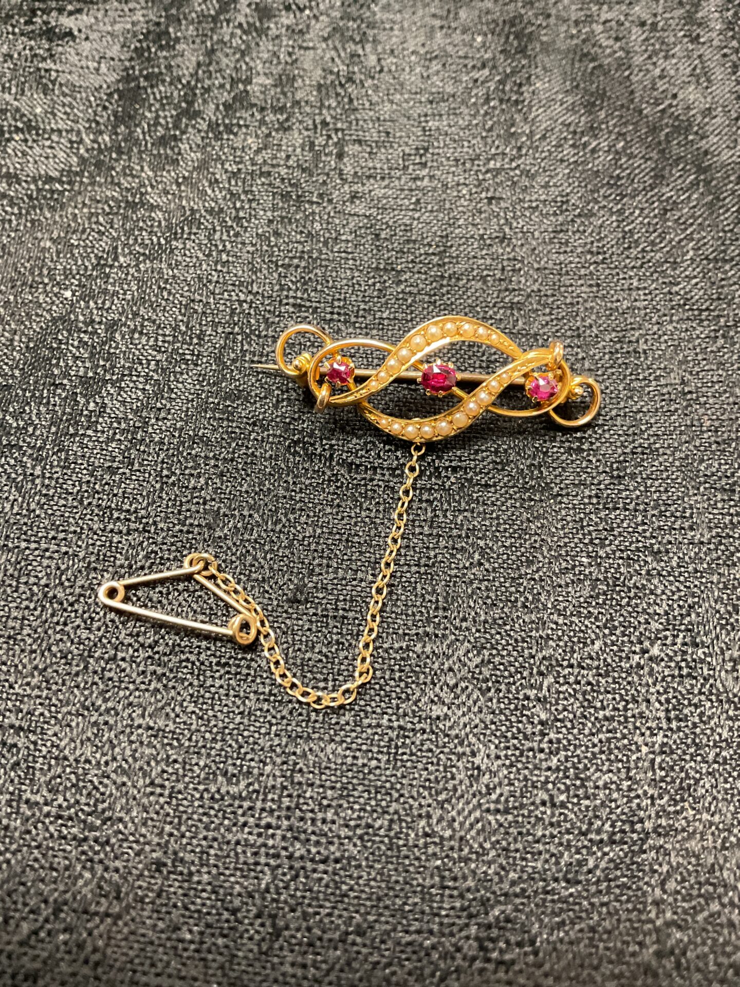This brooch presents as a well-preserved example of antique jewellery. While showing signs consistent with age and previous wear, it retains its inherent beauty and structural integrity. The combination of gold, pearls, and rubies makes it a desirable piece for collectors of vintage jewellery, and its classic design ensures it remains a stylish accessory for years to come.