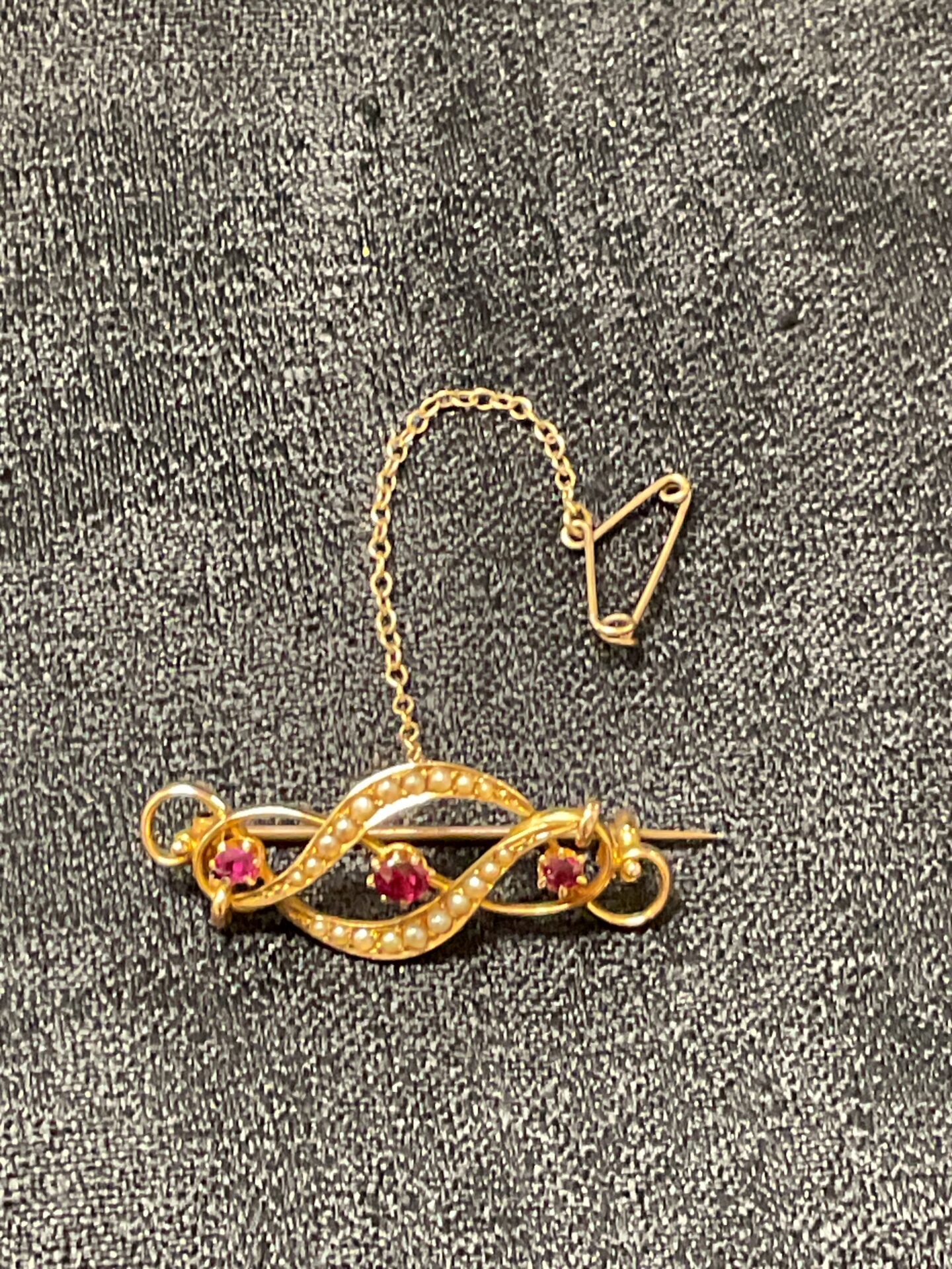 The brooch is in good antique condition, displaying the expected wear commensurate with its age. It retains its original charm and character, making it a desirable piece for collectors of antique jewellery. The combination of gold, pearls, and rubies adds to its appeal, and its classic design ensures it remains a timeless accessory.