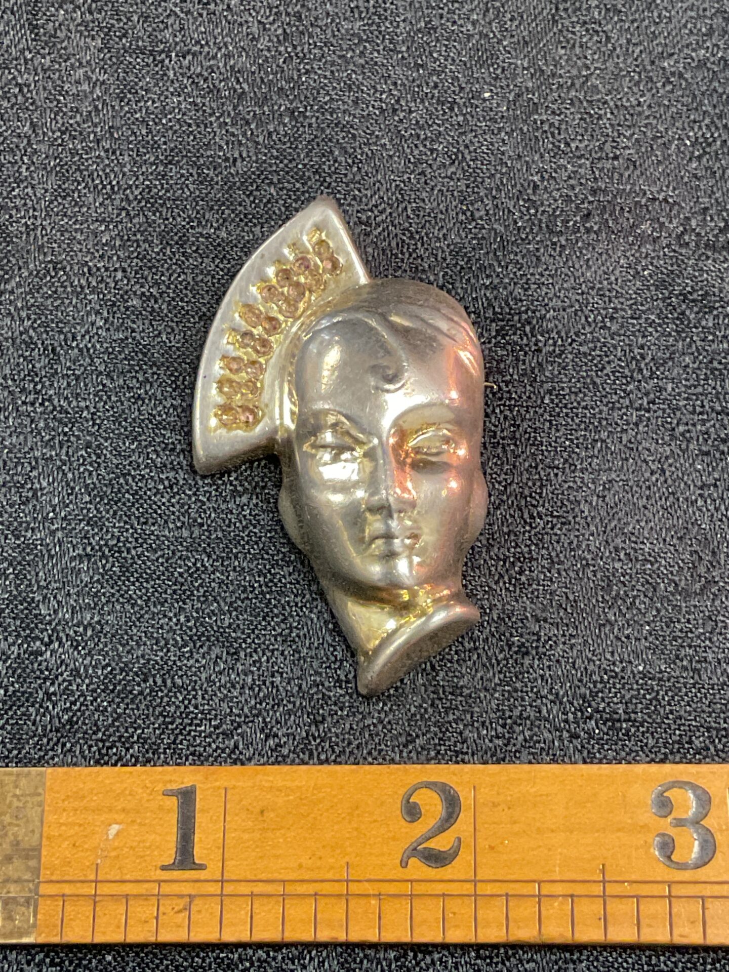 This striking brooch dates to the 1930s and is crafted from 925 sterling silver. The design features a sculpted face, reminiscent of Art Deco aesthetics, with elegant lines and a classic profile. Weighing 23.6g, this piece showcases the craftsmanship of the era and would have been a fashionable accessory for its time.