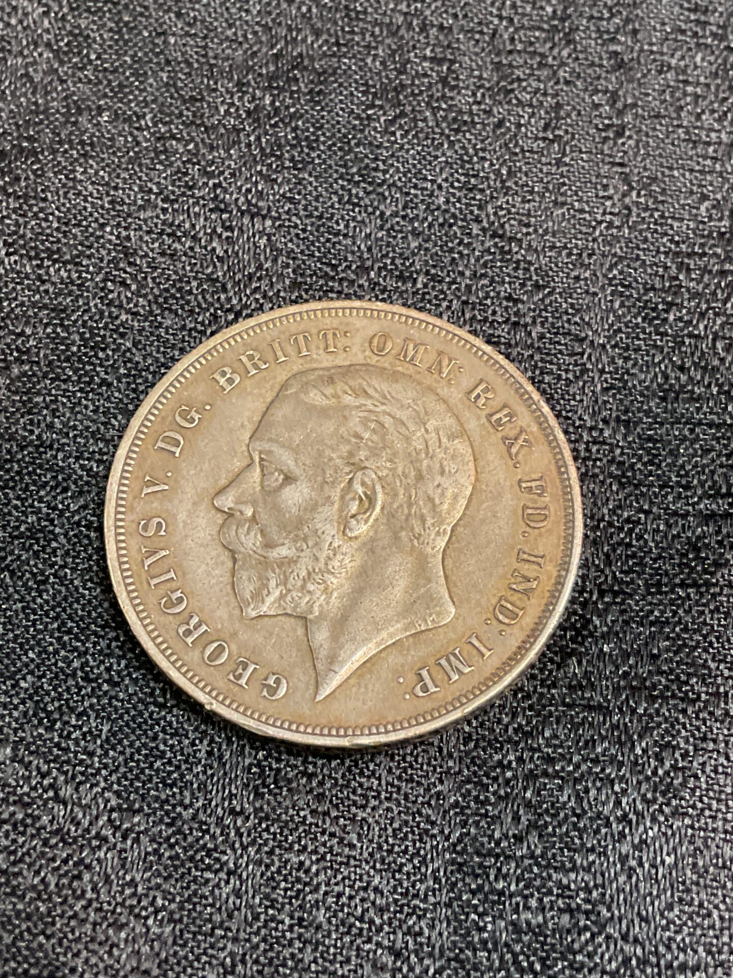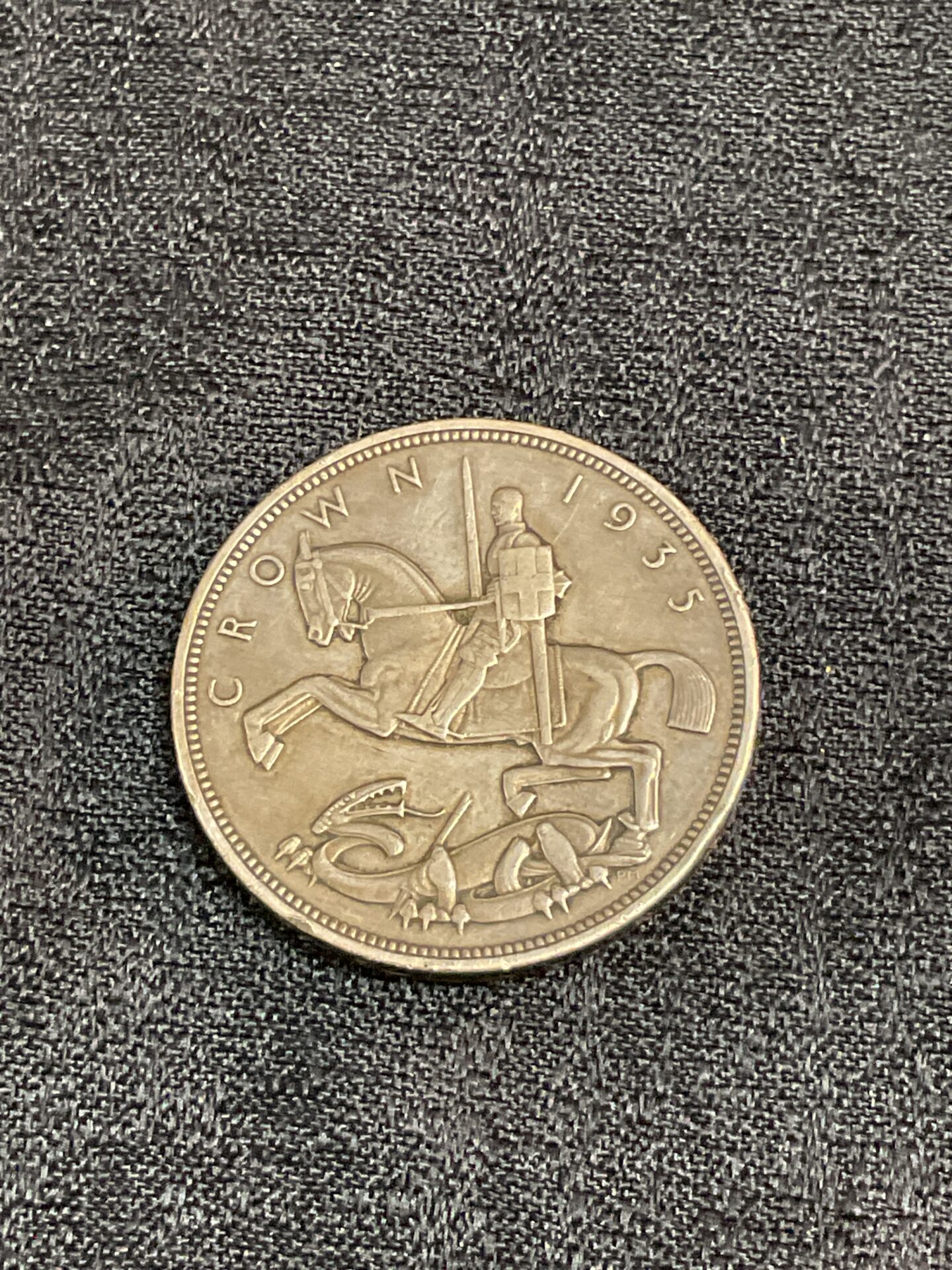 This is a 1935 Silver Crown coin, featuring the portrait of King George V. These coins were issued during his reign and are highly sought after by collectors. The coin is made of silver and displays a detailed portrait of the King on the obverse, along with the inscription “GEORGIVS V REX ET IMP” (George V, King and Emperor). The reverse typically features a design emblematic of Britain, often St. George slaying the dragon.