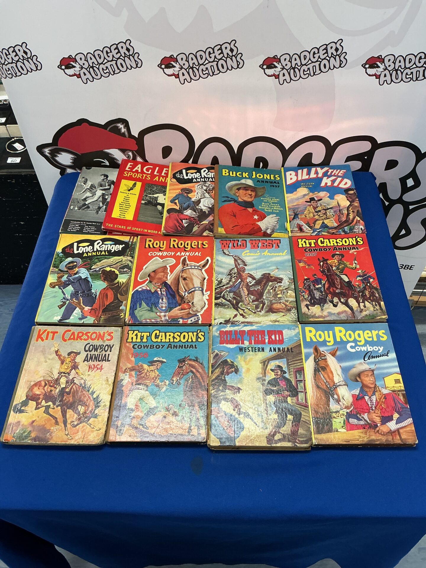 This lot comprises a selection of charming 1950s children’s annuals, featuring popular characters like Roy Rogers and the Lone Ranger. These annuals represent a nostalgic glimpse into mid-century childhood, filled with stories, illustrations, and activities designed to entertain young readers. The annuals showcase the colourful artwork and storytelling styles prevalent during this era, offering a delightful window into the past.
