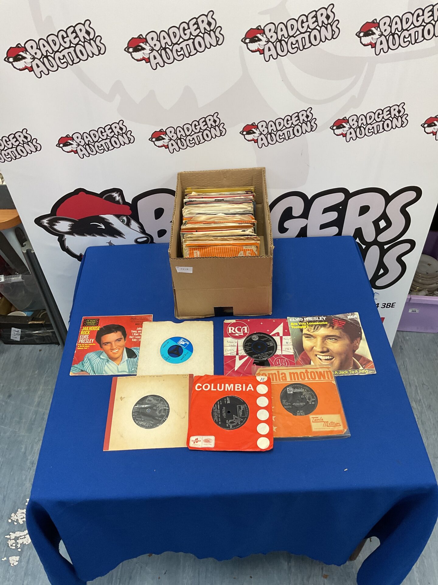This lot comprises a collection of 1960s vinyl singles, featuring a diverse range of artists and genres. The collection includes records from Motown Records and Elvis Presley, representing popular music from the era. These 45 RPM records offer a glimpse into the musical landscape of the 1960s, showcasing the sounds that defined a generation.
