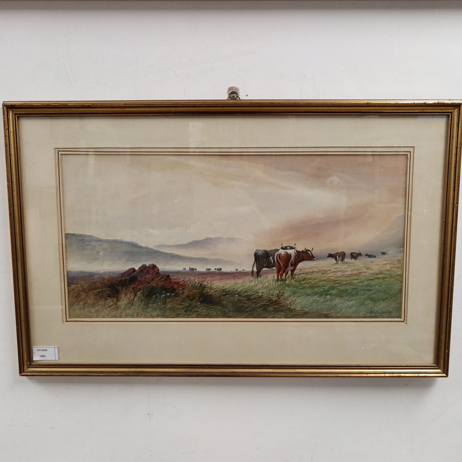 This is a 19th-century watercolour painting depicting cattle in a highland landscape. The artwork showcases a pastoral scene with cattle grazing in a field, set against a backdrop of rolling hills and a cloudy sky. The artist has employed a delicate watercolour technique to capture the textures of the landscape and the animals, creating a serene and evocative atmosphere. The painting is signed by the artist, though the signature is difficult to decipher.