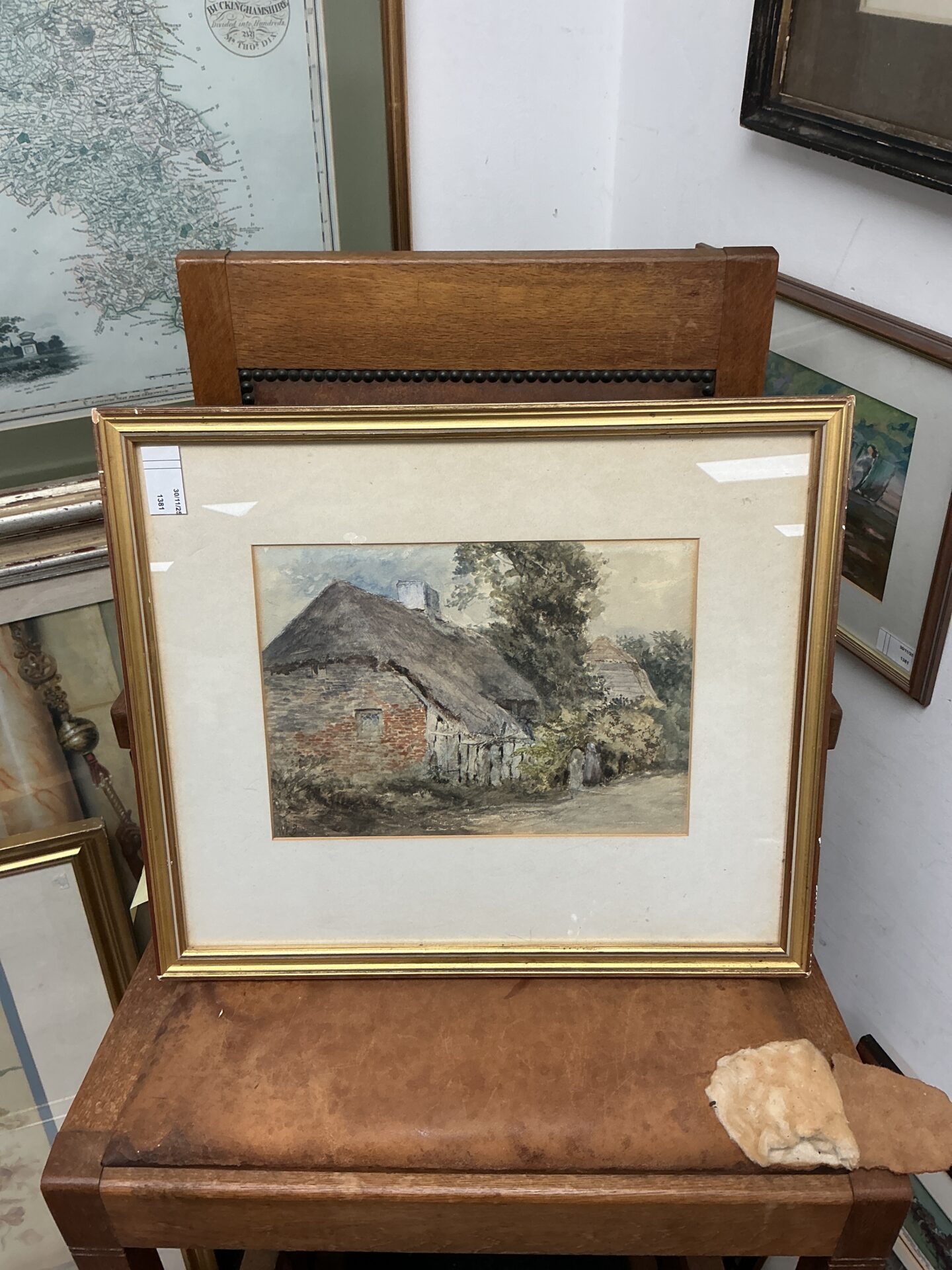 This is a 19th-century watercolour painting depicting a charming cottage scene. The artwork is signed ‘W L B’ and features figures beside a thatched cottage, rendered in delicate washes and details typical of the period. The painting evokes a sense of idyllic rural life and showcases the artist’s skill in capturing light and atmosphere.
