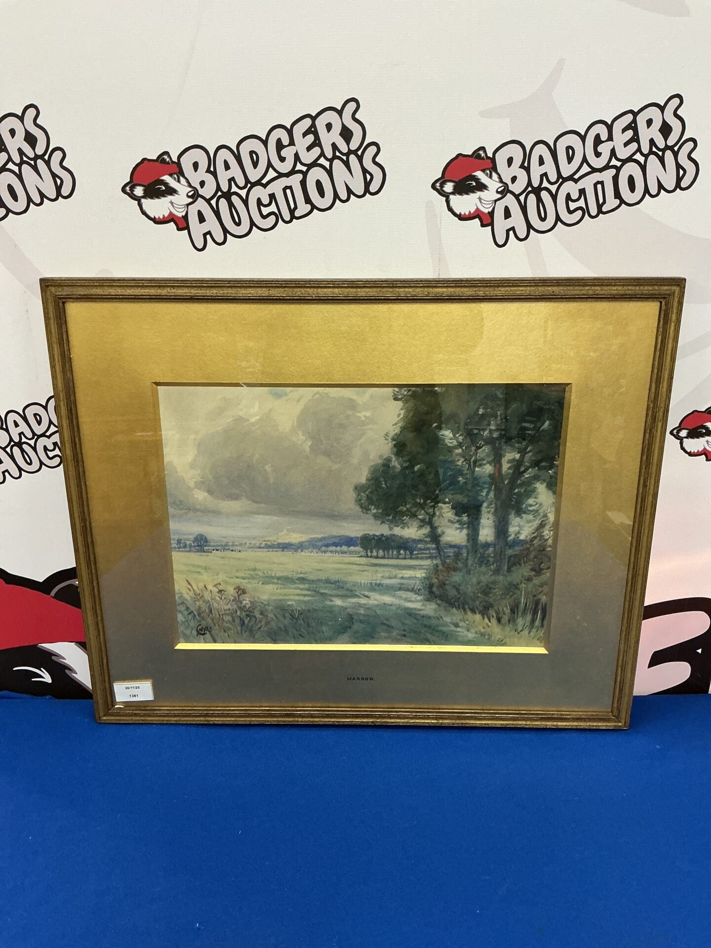 This is a 19th-century watercolour painting, beautifully presented in a gilt frame. The artwork depicts a serene landscape scene, likely rural, with a focus on fields and natural light. It is signed with a monogram, adding to its artistic and historical appeal. The style suggests a traditional approach to landscape painting, common during the 1800s.