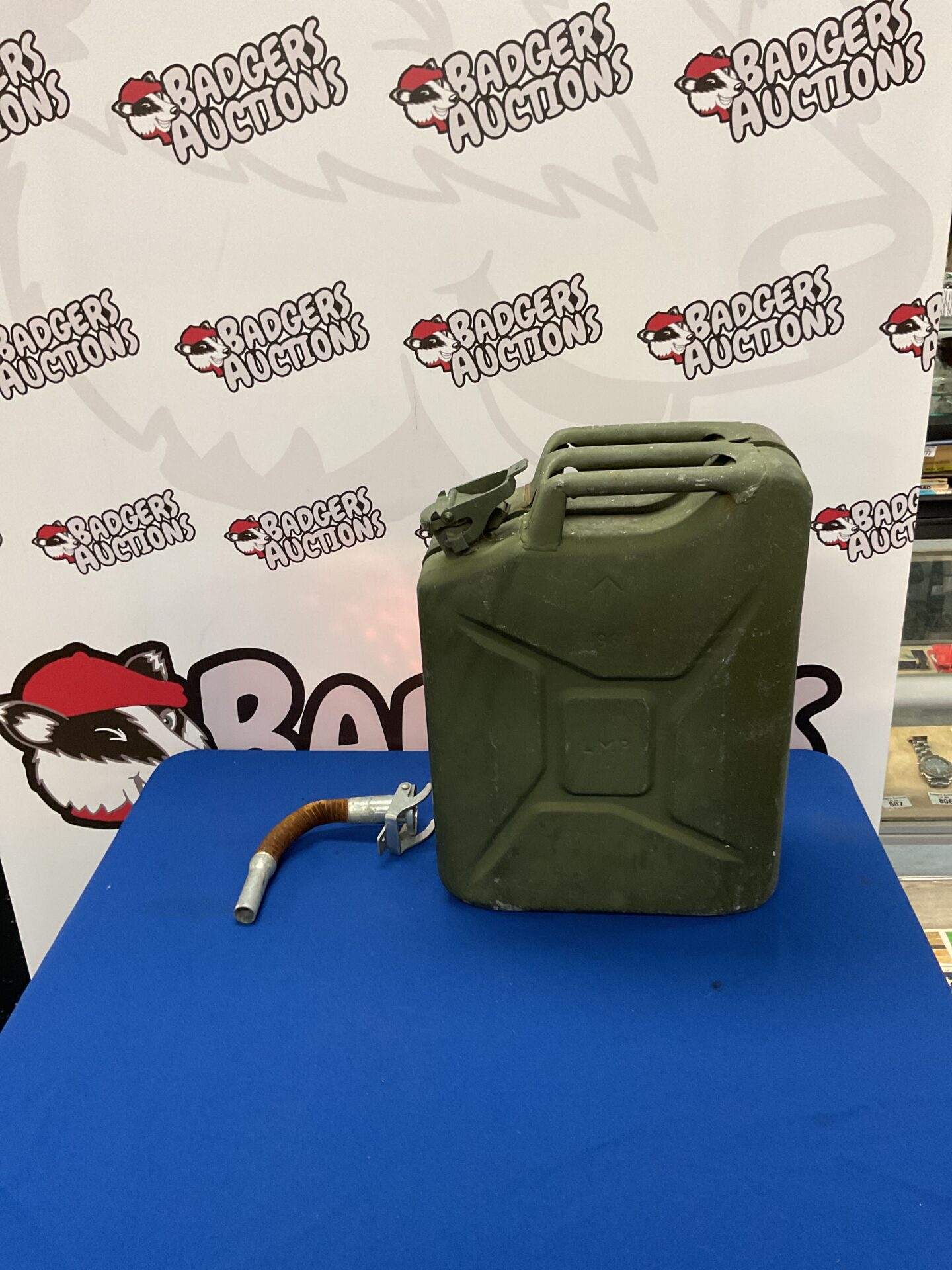 This fuel can shows signs of previous use and wear, consistent with its age and intended purpose. It may exhibit surface scratches, dents, or other cosmetic imperfections. Despite this, it remains a potentially interesting item for collectors of military surplus, automobilia, or vintage tools, and could also be used for practical fuel storage.