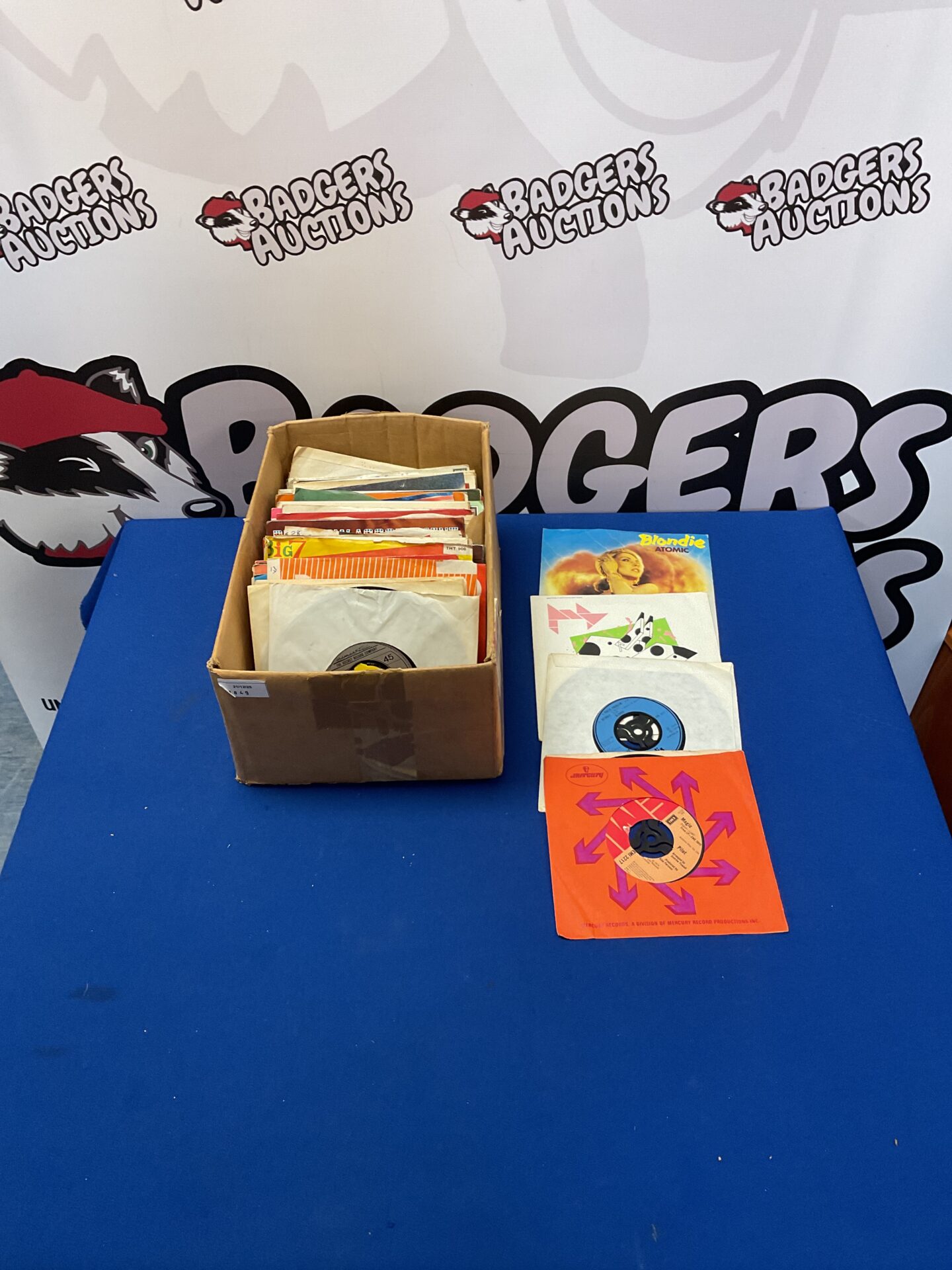 This lot comprises a collection of 45 RPM vinyl records. The records appear to span various genres and artists, offering a diverse selection for collectors or enthusiasts. The collection is presented as a mixed lot, providing an opportunity to discover hidden gems and expand one’s musical library.