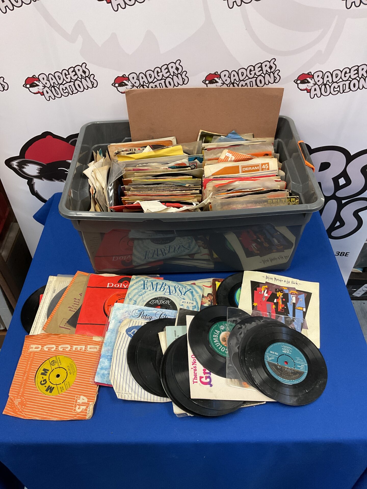 This is a large lot of 7-inch vinyl single records. The collection appears to span various genres and artists, offering a diverse selection for enthusiasts. The records are housed within a storage box, ready for sorting and enjoyment.