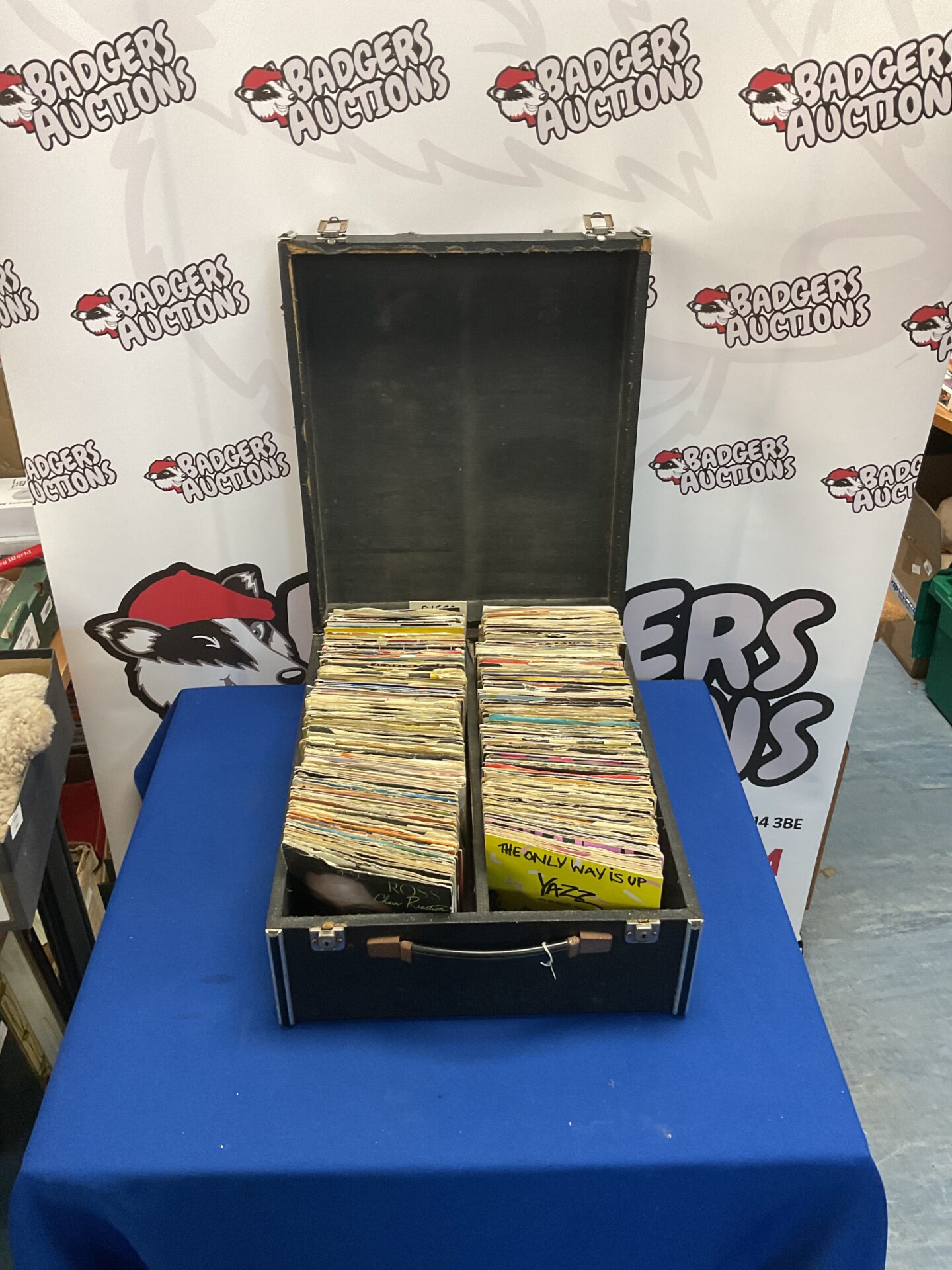 This lot comprises a collection of 7-inch vinyl records housed within a weathered wooden case. The records appear to span various genres, offering a diverse selection for enthusiasts. The case itself adds a rustic charm, suggesting a history of storage and transport of these musical treasures.