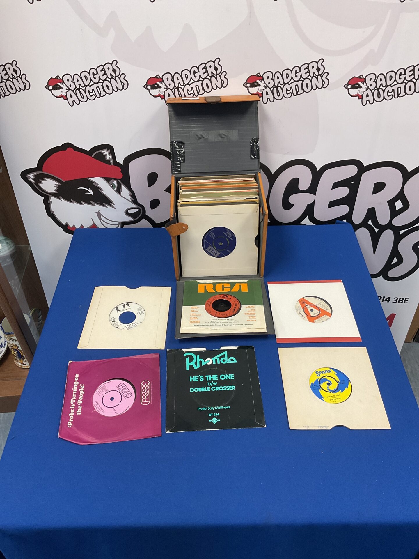 This lot comprises a collection of 7-inch vinyl singles, representing popular music from the 1970s and 1980s. The collection appears to span various genres, offering a glimpse into the musical landscape of the era. These singles would have been widely played on record players and jukeboxes during their time, and represent a tangible piece of music history.