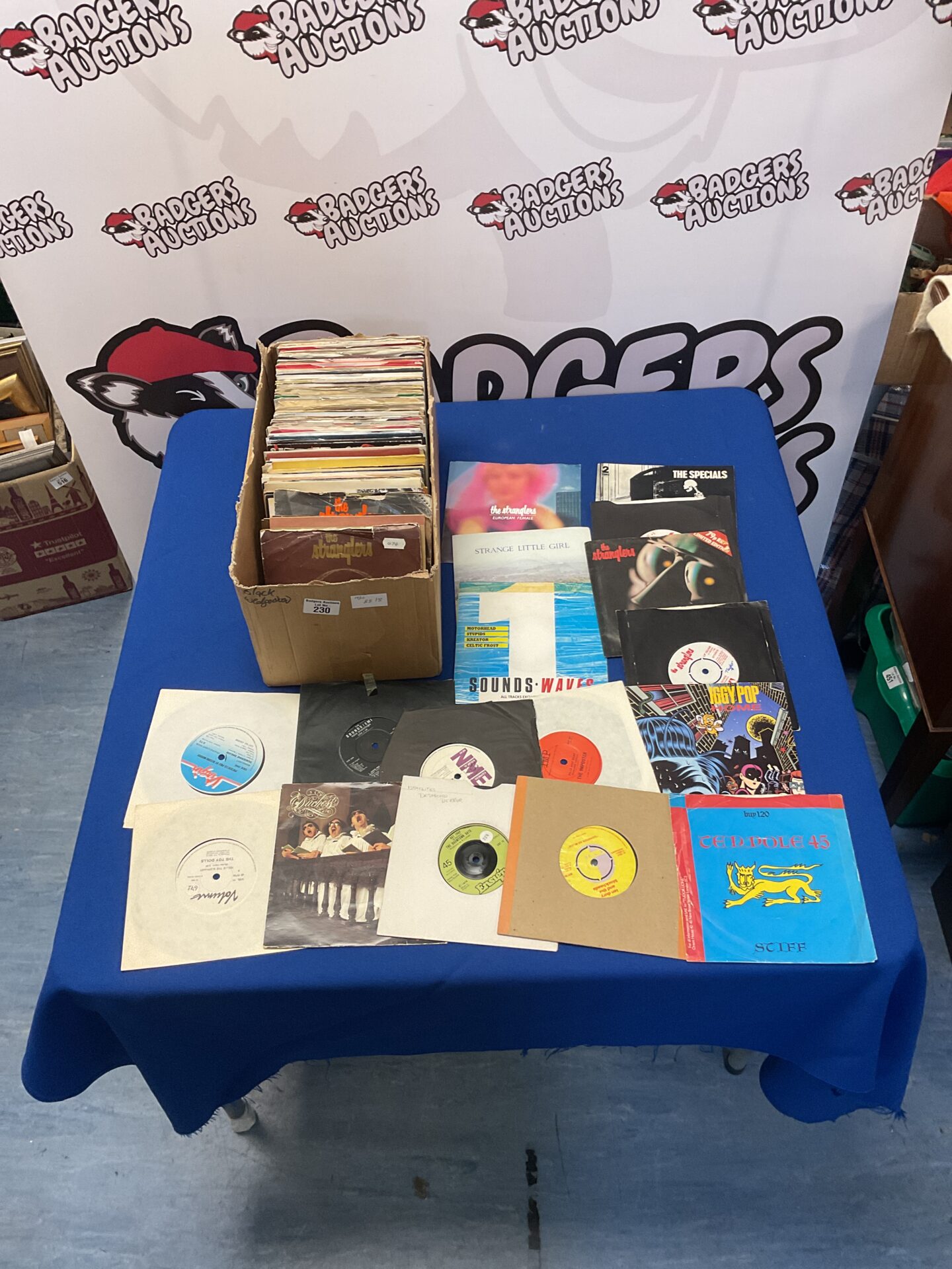 This lot comprises a collection of 7-inch vinyl singles, primarily spanning the punk, reggae, and new wave genres. The collection appears to date from the late 1970s and early 1980s, offering a snapshot of the musical landscape of the era. The singles represent a diverse range of artists and styles within these genres, making it an interesting collection for enthusiasts.