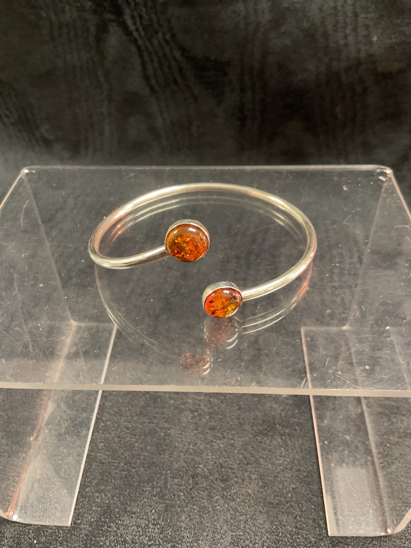 This beautiful bracelet features a twisted band of 925 sterling silver, accented with warm amber cabochons at each end. Weighing 6.5g, it’s lightweight, comfortable, and perfect for adding a touch of bohemian style to any outfit. A timeless piece for collectors or everyday wear.