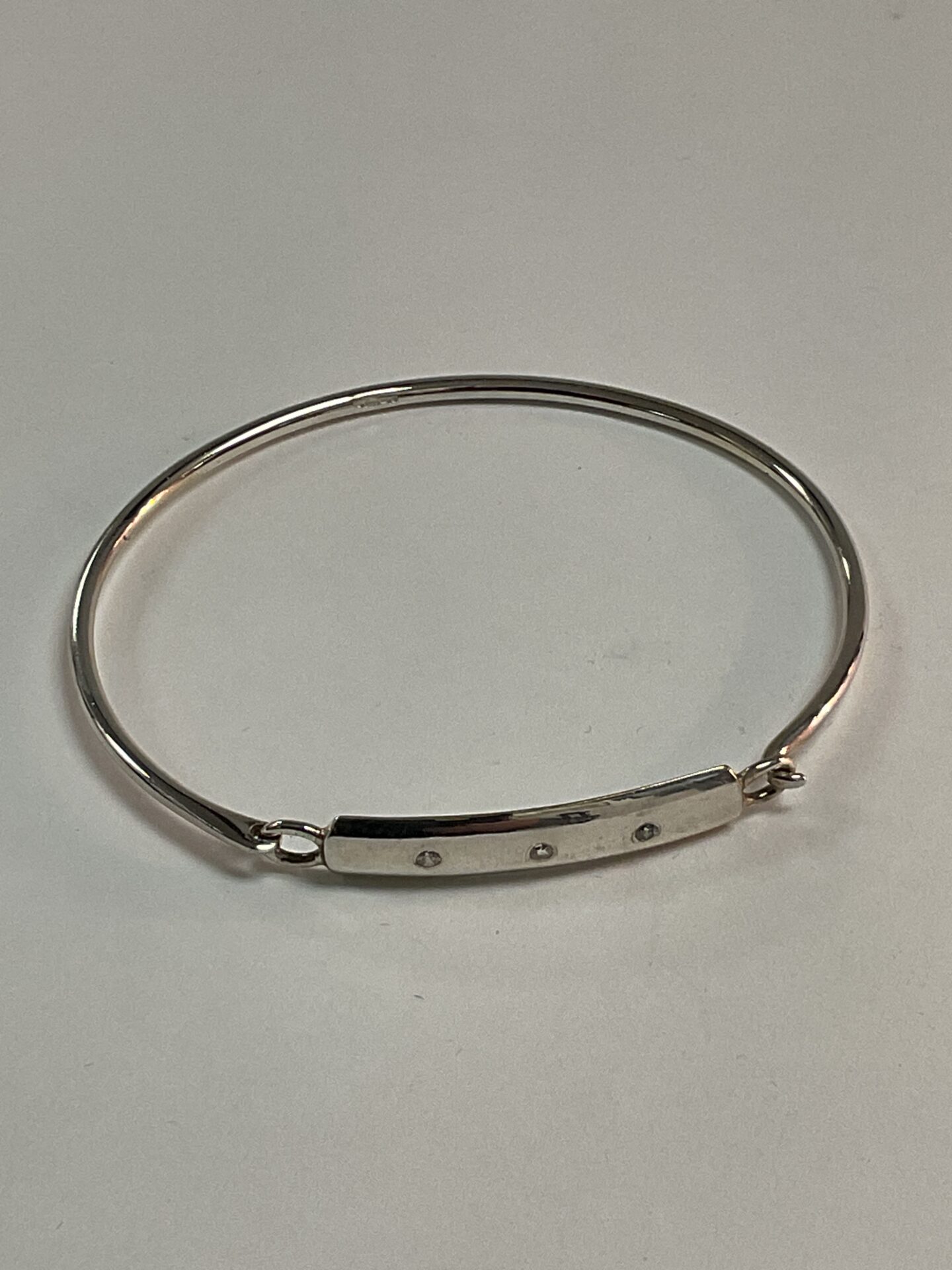 This elegant bracelet is crafted from 925 silver and features three white stones set into the band. The design is delicate and understated, making it suitable for everyday wear or special occasions. Weighing 9.7g, the bracelet offers a comfortable fit and a subtle sparkle.