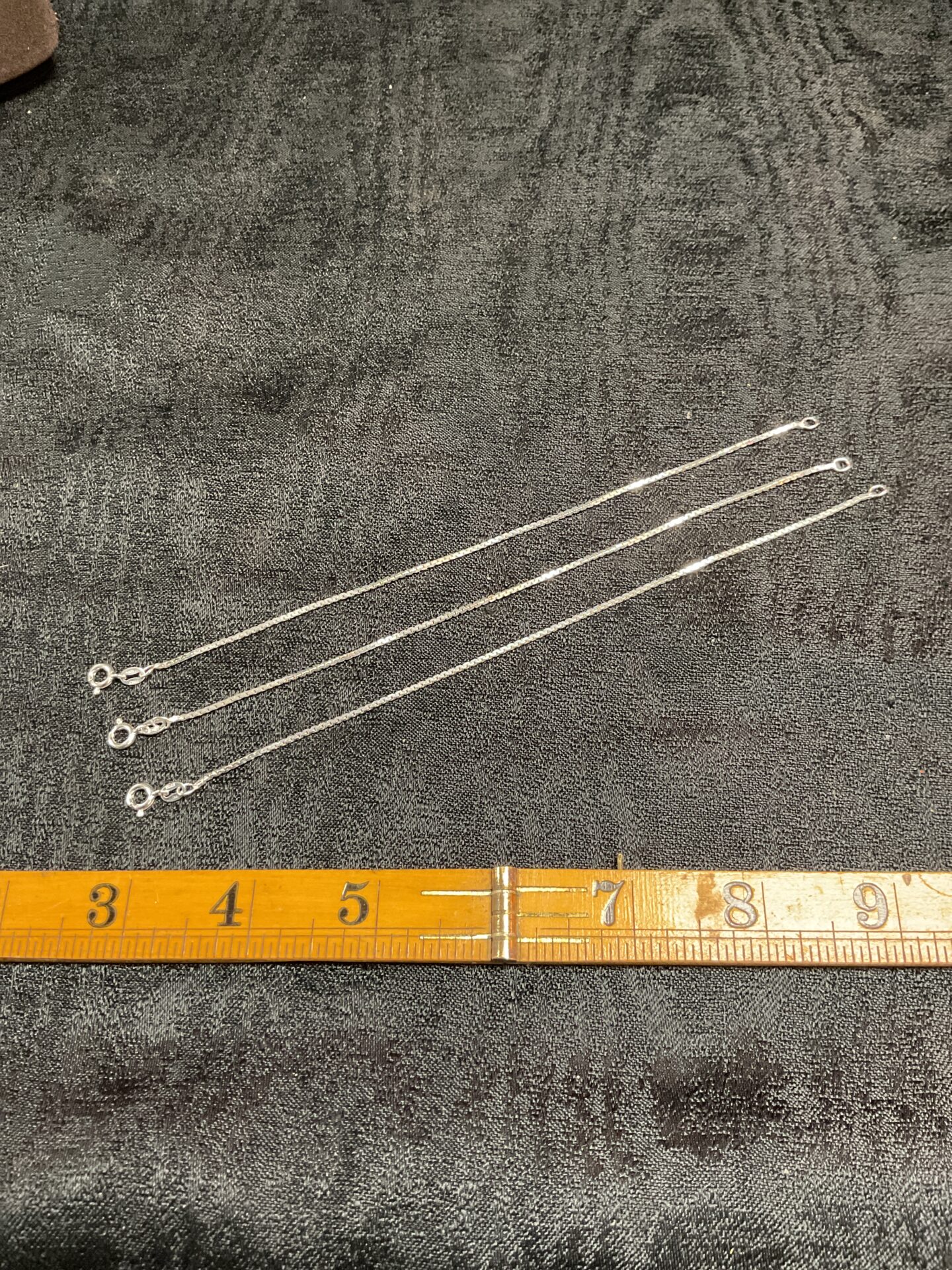 This lot comprises three delicate bracelets crafted from 925 sterling silver. Each bracelet features a fine chain design, offering a minimalist aesthetic suitable for everyday wear or layering with other jewellery pieces. The simple lobster clasp closures ensure secure and easy fastening.