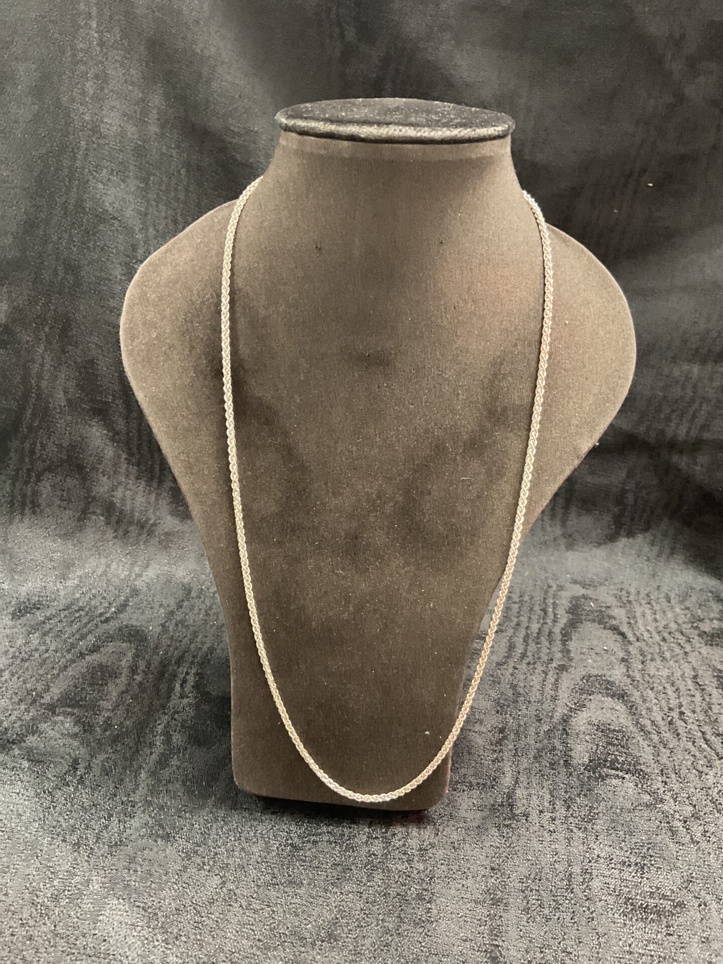 This is a substantial 22-inch long chain necklace crafted from 925 sterling silver. The chain features a classic design and a weighty 12g construction, suggesting quality and durability. This necklace is suitable for both men and women and can be worn as a statement piece or layered with other jewellery.