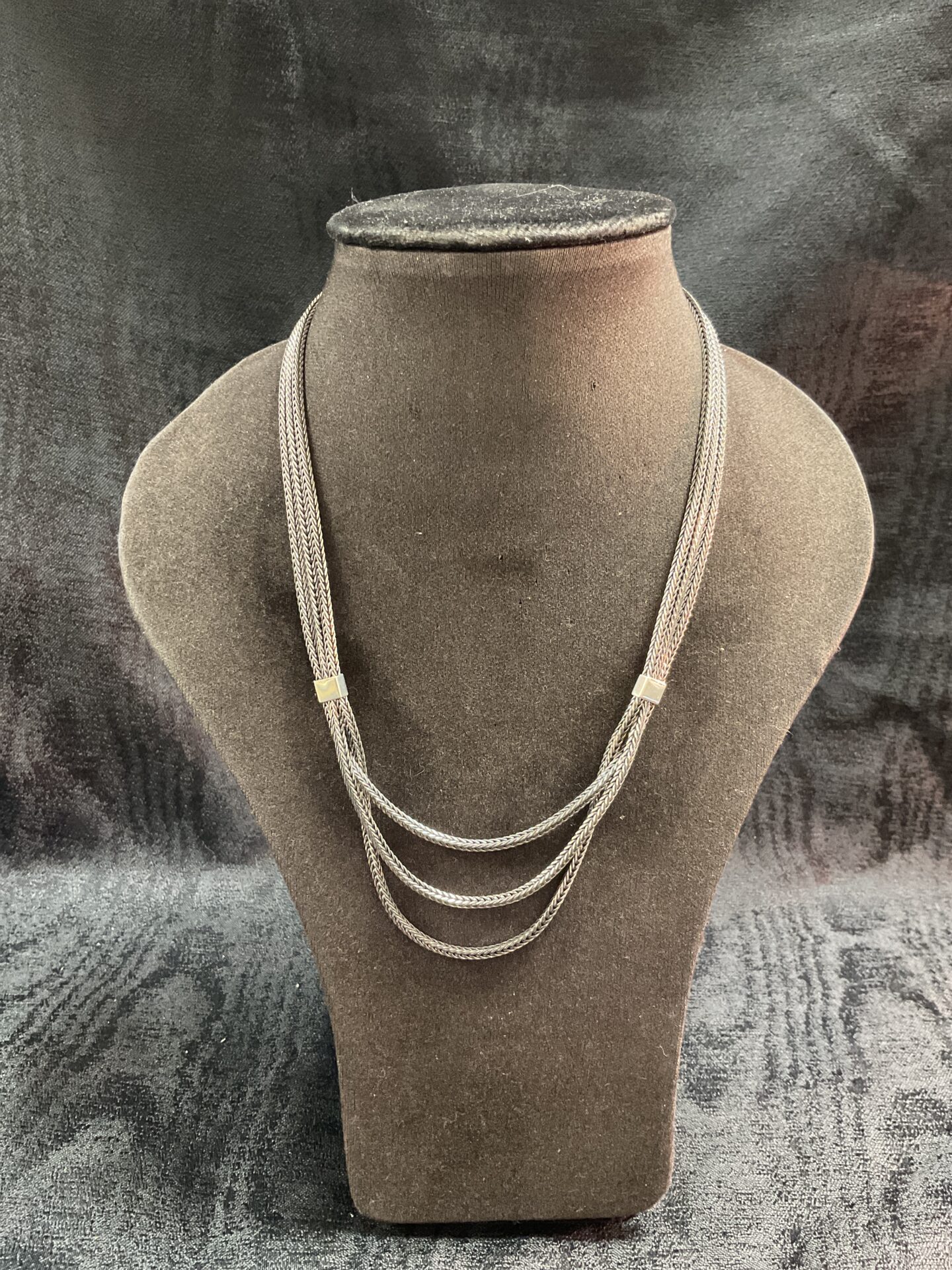 This elegant necklace is crafted from 925 sterling silver, featuring three delicate strands that create a beautiful layered effect. Measuring 16 inches in length and weighing 28 grams, this necklace is perfect for everyday wear or special occasions. The simple yet sophisticated design makes it a versatile piece that can be paired with a variety of outfits.