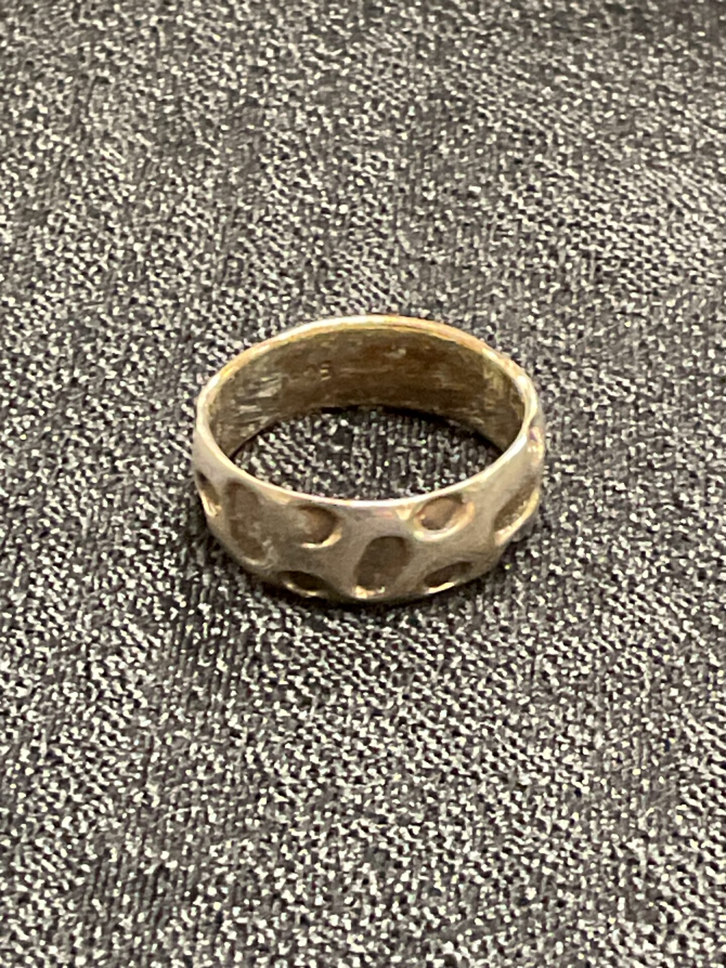 This is a handcrafted ring fashioned from 925 sterling silver. The ring features a bold, textured band with a unique, organic aesthetic. The design incorporates a series of raised, rounded elements across the surface, creating a tactile and visually interesting piece. This ring is a size M.