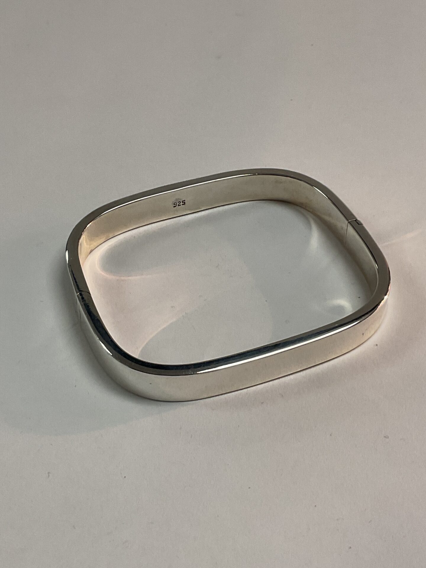 This striking bracelet is crafted from 925 sterling silver, featuring a bold square design. Weighing 14g, it presents a modernist aesthetic, likely dating from the mid to late 20th century. The substantial construction and clean lines suggest a focus on form and material, making it a statement piece for any collection.