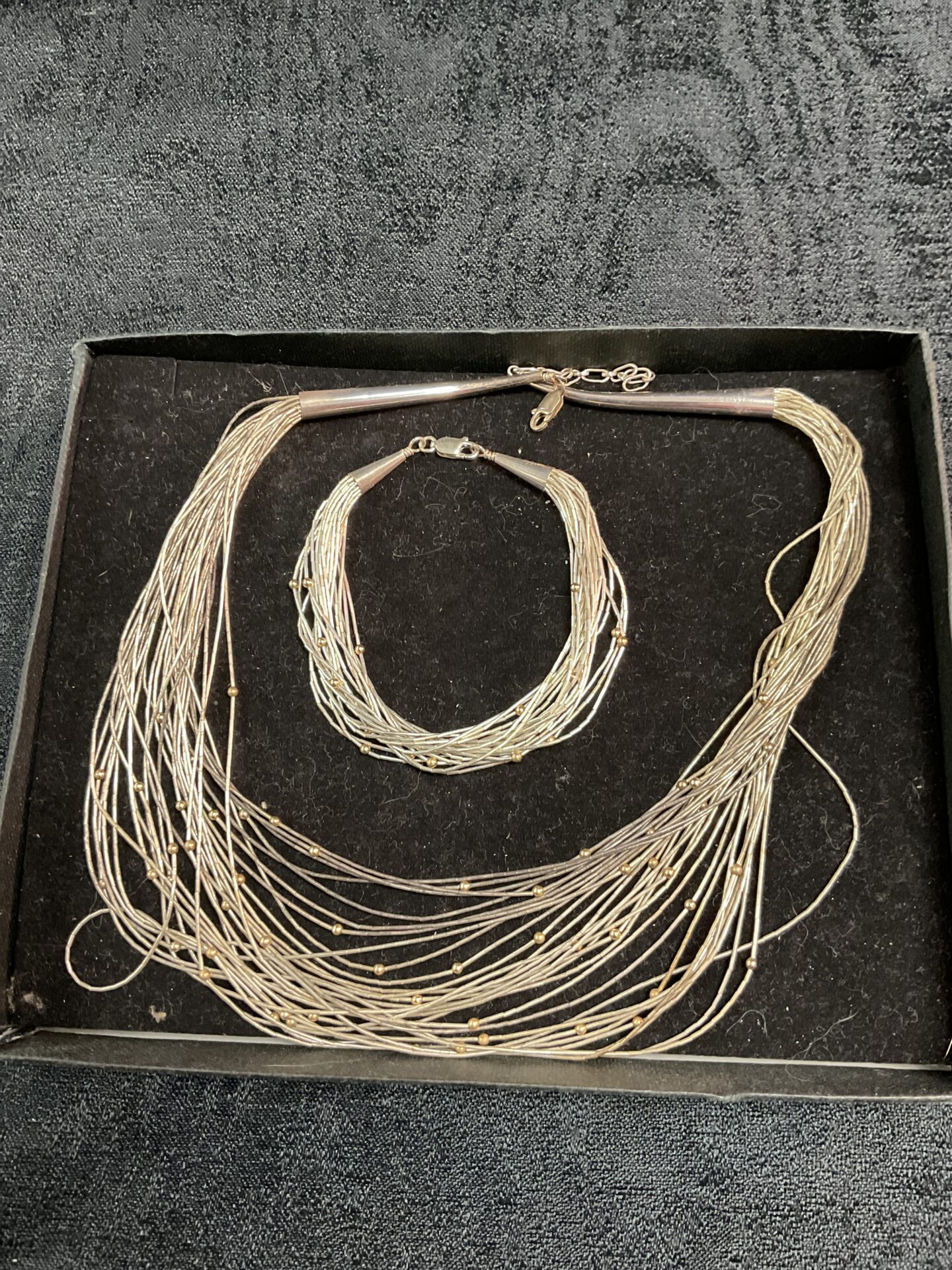 This silver strand set appears to be in good condition, displaying the expected patina consistent with vintage silver jewellery. The strands remain intact and flexible, and the clasp and bracelet closure function as intended. This set would appeal to collectors of vintage silver jewellery or those seeking a unique and elegant accessory.