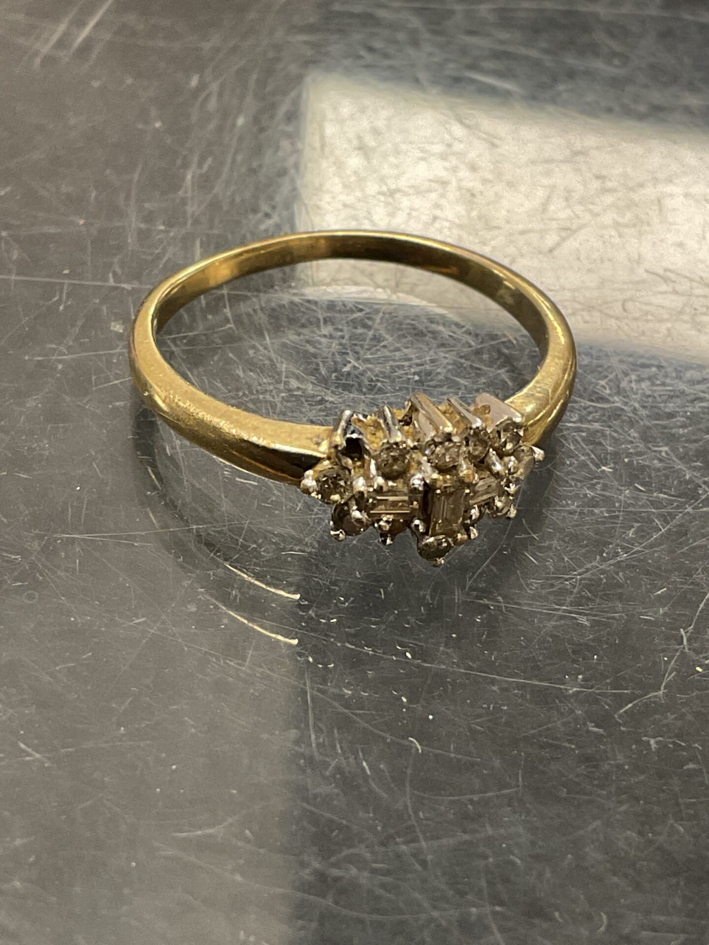 This is a 9ct gold diamond cluster ring, weighing 2.2g and sized Q. The ring features a cluster of square cut diamonds, creating a sparkling and eye-catching design. The warm tone of the 9ct gold complements the brilliance of the diamonds, making it a classic and versatile piece of jewellery.