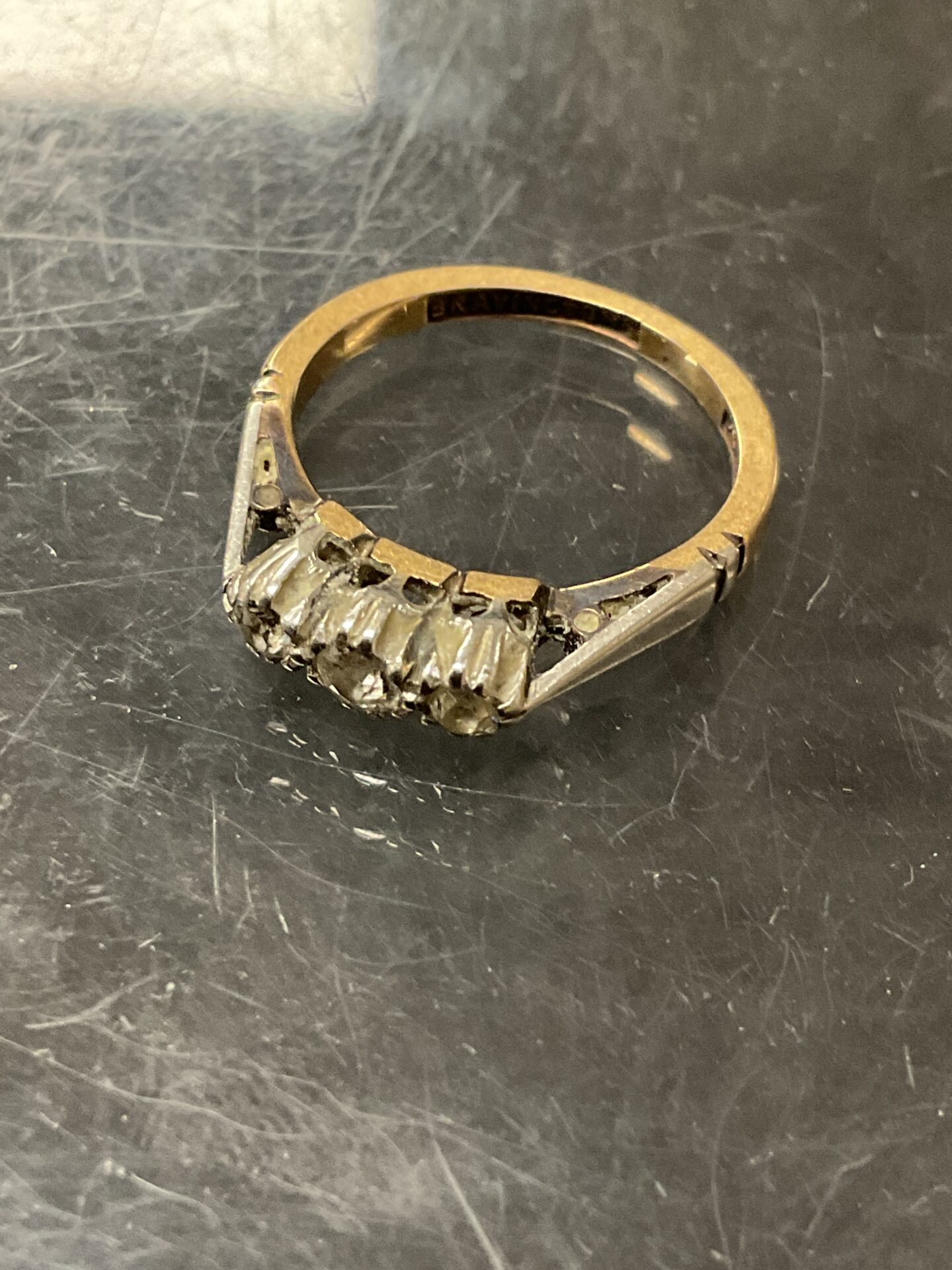 The ring is in good condition, ready to be enjoyed. It presents a lovely opportunity for a collector of vintage jewellery or a buyer seeking a timeless piece. The combination of 9ct gold and platinum, along with the three diamonds, makes this ring a desirable and attractive addition to any jewellery collection.