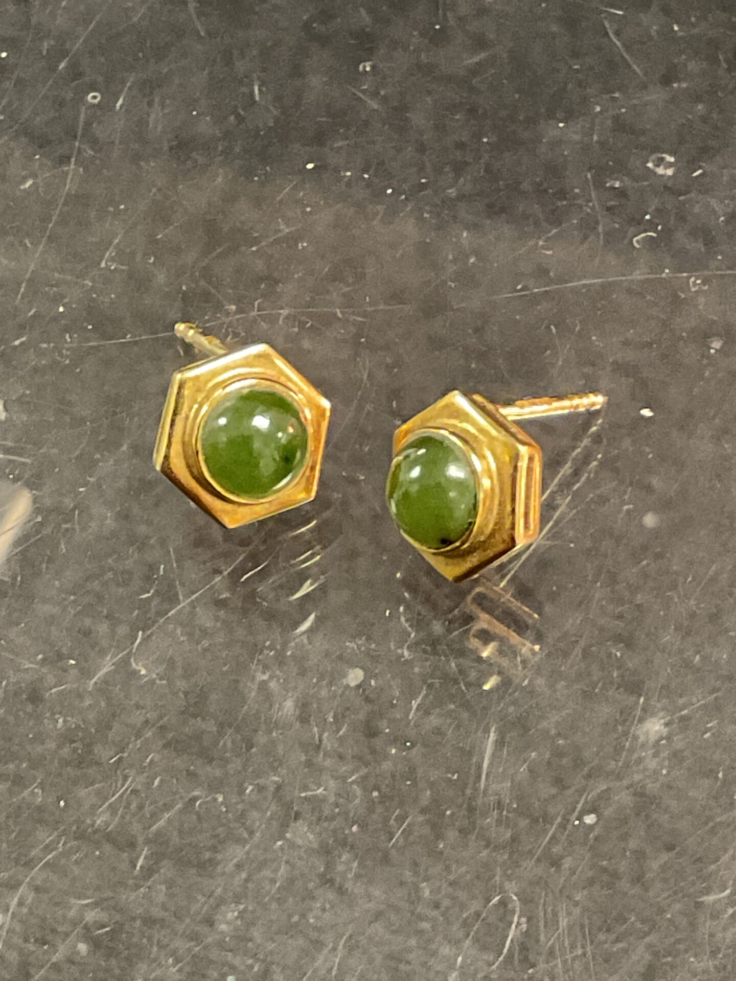 These classic stud earrings feature a hexagonal setting, crafted from 9ct gold. Each earring is set with a vibrant green stone, likely a peridot or similar gemstone, creating a striking contrast with the warm gold. The design is simple yet elegant, making them suitable for everyday wear or special occasions.