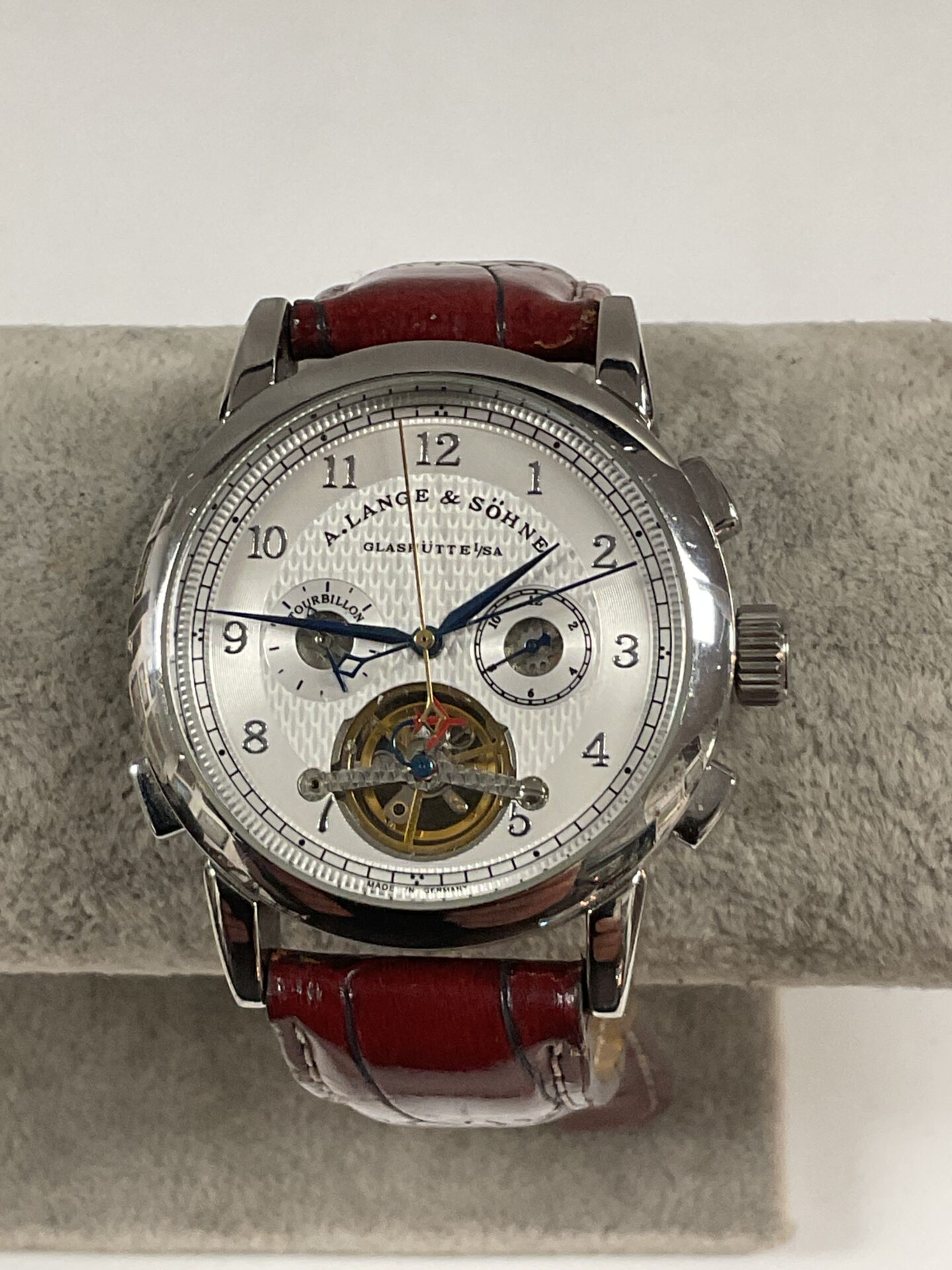 This watch is offered in a used condition, and its functionality is not guaranteed. The watch may appeal to collectors of reproduction timepieces or those interested in the aesthetic of A Lange & Sohne watches. Please examine the images carefully to assess its condition before considering a purchase.