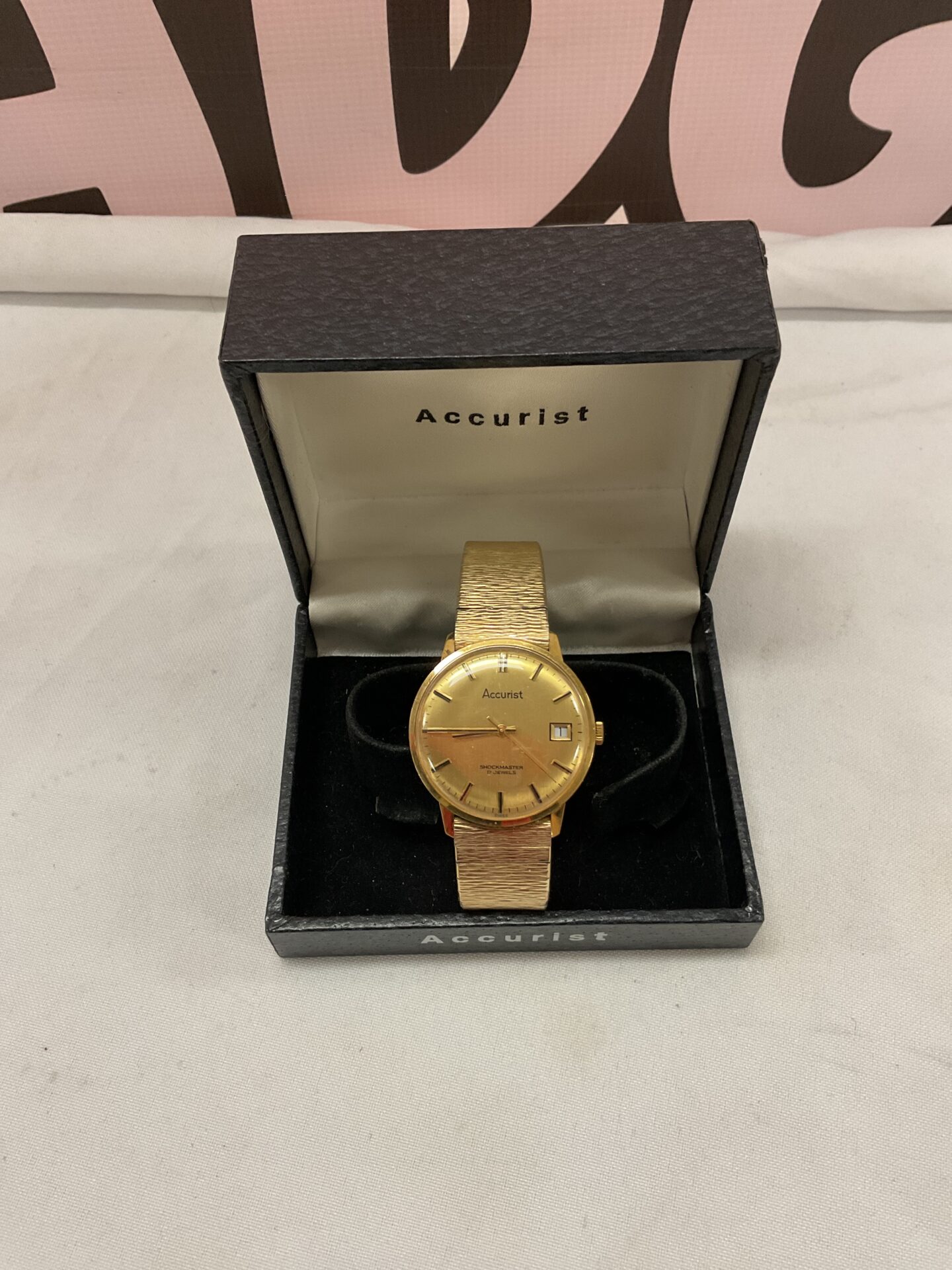The watch appears to be in its original condition, though its operational status is unknown. The gold plating shows signs of wear consistent with age, adding to its vintage charm. This Accurist Shockmaster would be of interest to collectors of vintage watches, particularly those interested in British-made timepieces from the mid-20th century.