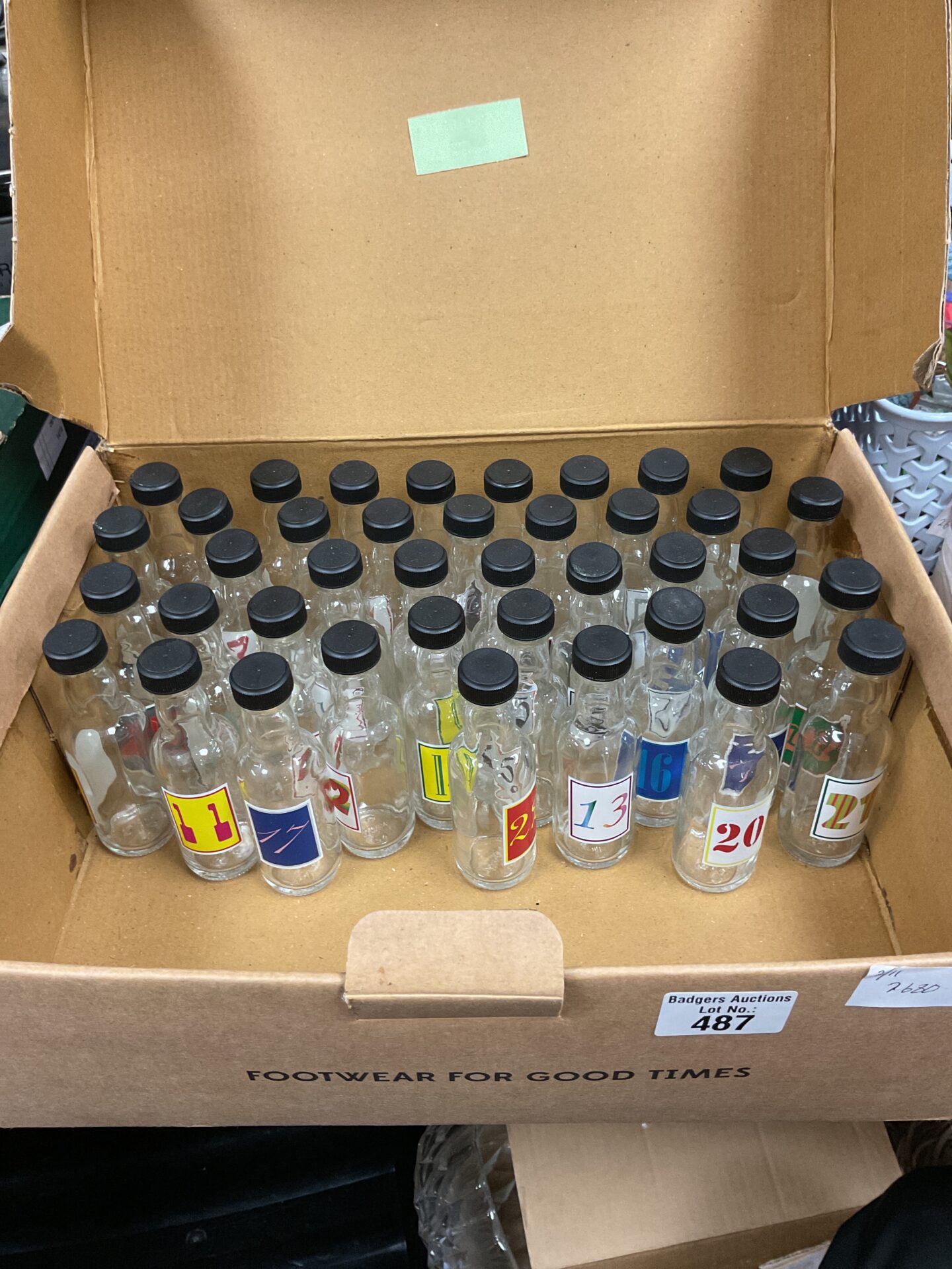 This lot comprises a collection of miniature glass bottles, designed for use as an advent calendar. Each bottle is approximately 50ml in size and features a numbered label, ranging from 1 to 24, suggesting they were intended to be filled with small treats or gifts for each day leading up to Christmas. The bottles are clear glass, allowing the contents to be visible, and are presented in a cardboard box for storage and display.