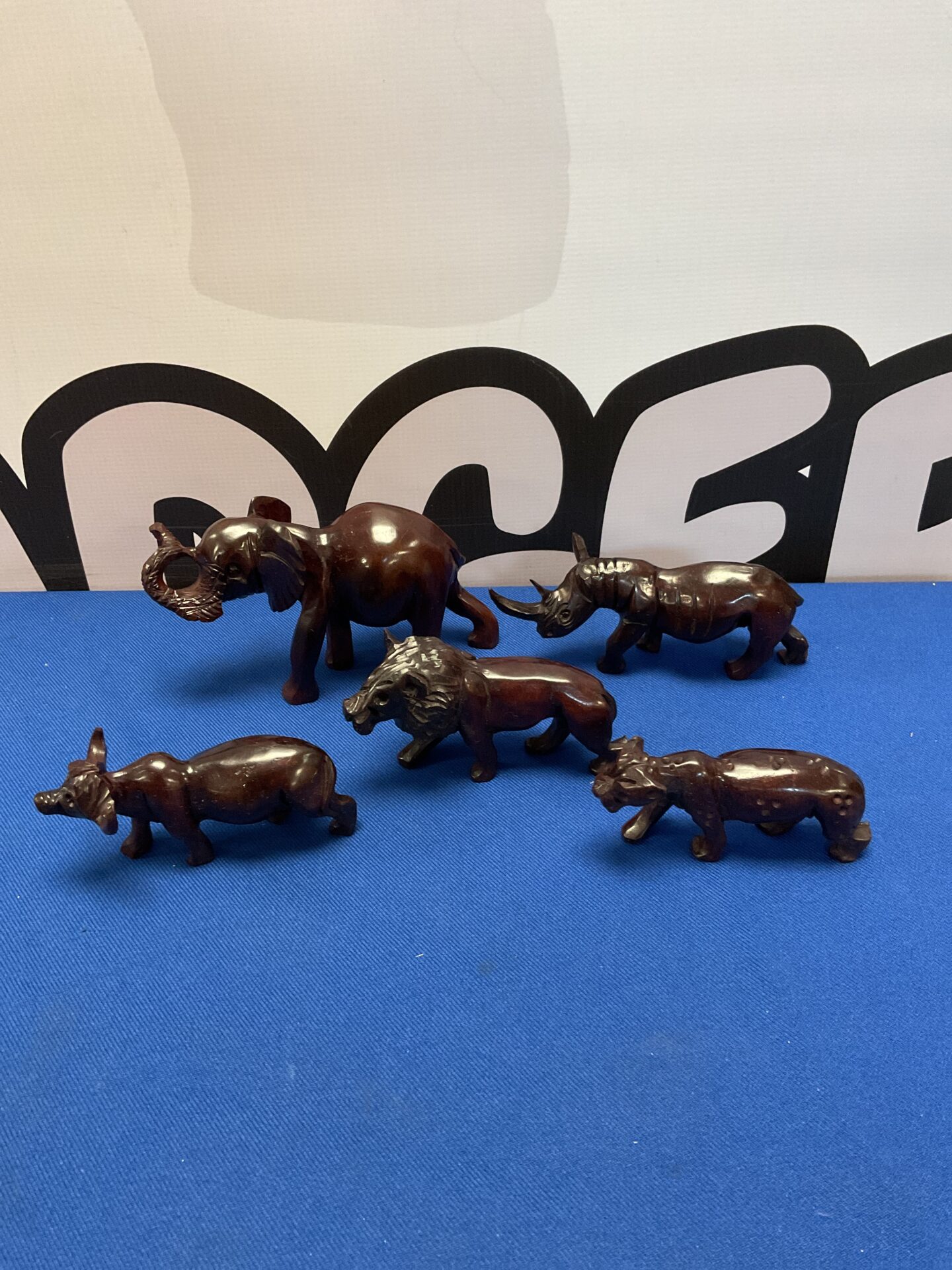 This set comprises five hand-carved wooden animal figurines, representing the African Big Five: lion, elephant, rhinoceros, leopard, and buffalo. The carvings exhibit a rustic, tribal aesthetic, likely crafted from a dense hardwood. Each animal is depicted in a standing pose, showcasing the characteristic features of its species. The carvings are intended as decorative objects, evoking the spirit of the African savanna.
