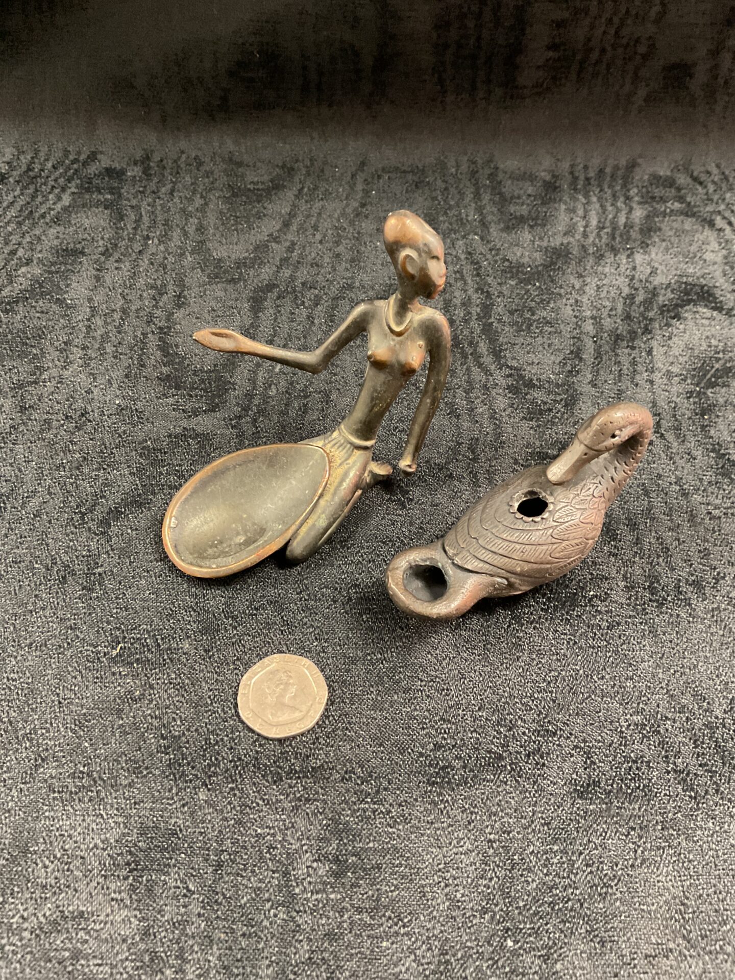 This lot comprises two intriguing bronze artifacts: a stylized African figure and a small oil lamp. The figure, likely representing a deity or ancestral spirit, exhibits a graceful pose and detailed craftsmanship. The oil lamp, also cast in bronze, features a simple yet elegant design, indicative of its functional purpose in providing illumination. Both pieces showcase the artistic traditions and metalworking skills of their origin, likely dating from the 20th century or earlier.