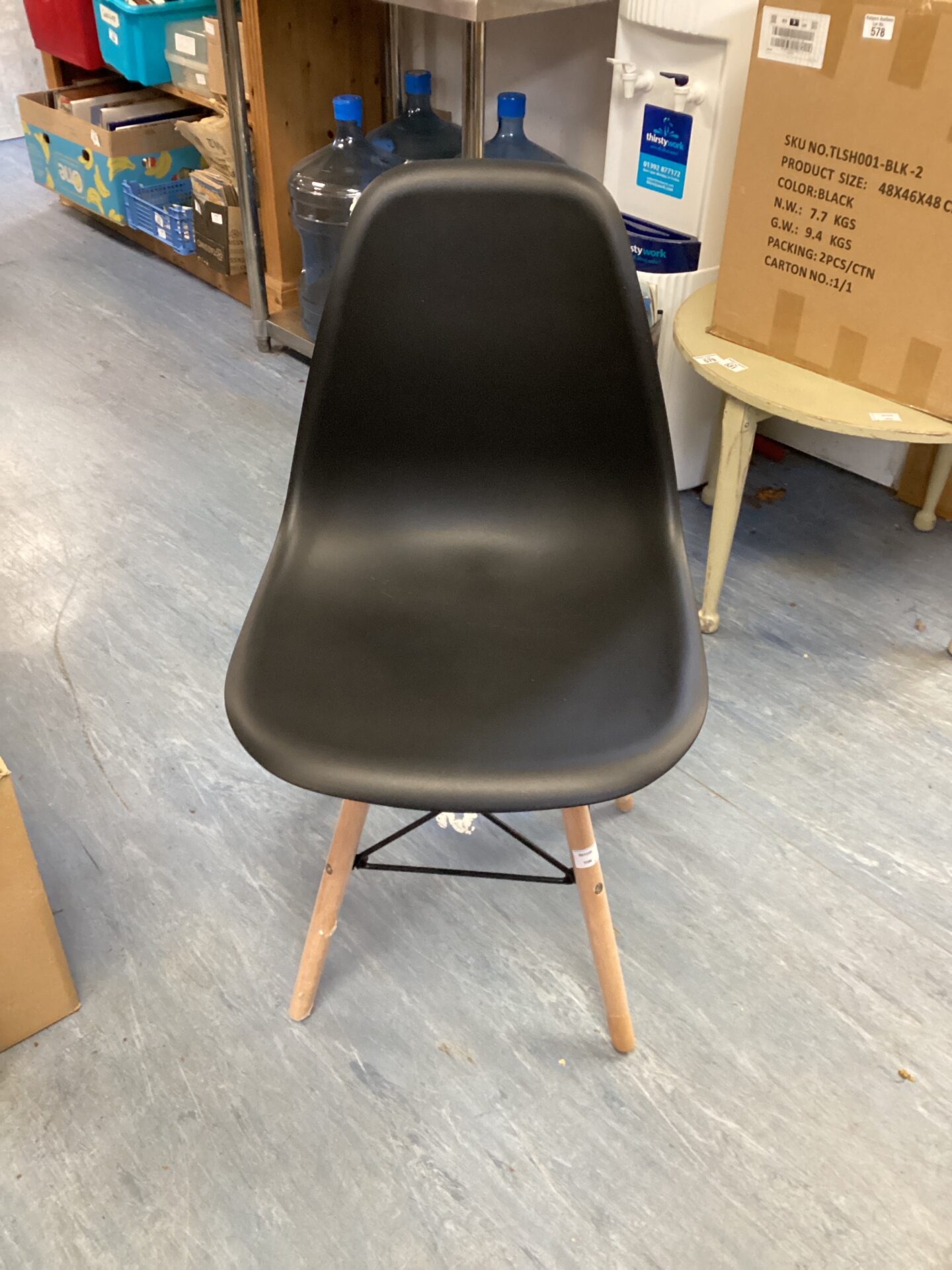 This Ainpecca chair offers a stylish and comfortable seating solution with its molded plastic seat and wooden base. Inspired by mid-century modern design, this chair is versatile enough for dining rooms or home offices. One chair is new in box, and the other appears to be in good condition.