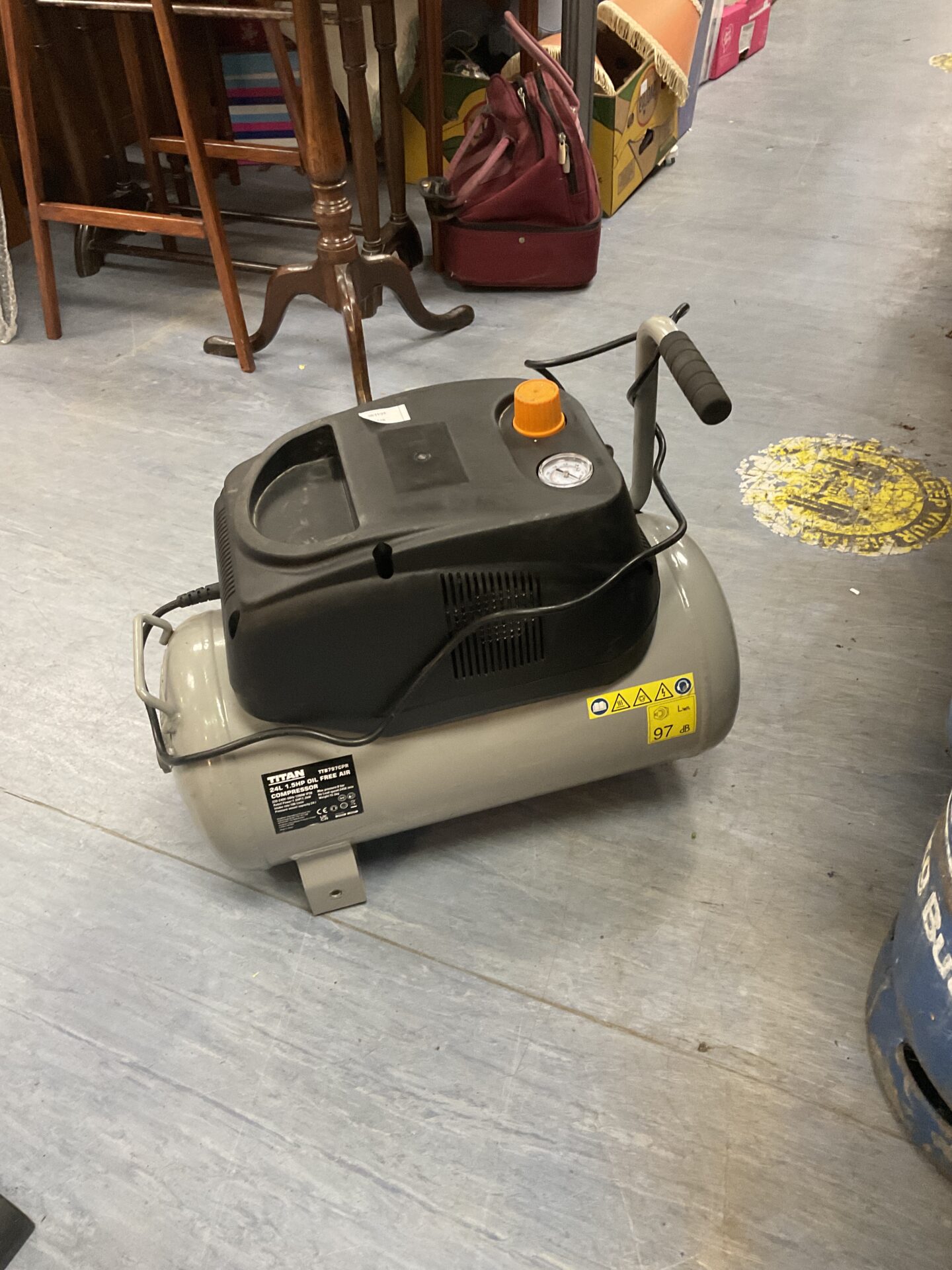 This Titan TTB797CPR 24l oil-free air compressor is offered for spares or repair. It powers on but exhibits a burning smell and does not hold pressure. A portable unit suitable for garages or workshops, it’s ideal for a DIY enthusiast or someone seeking parts.