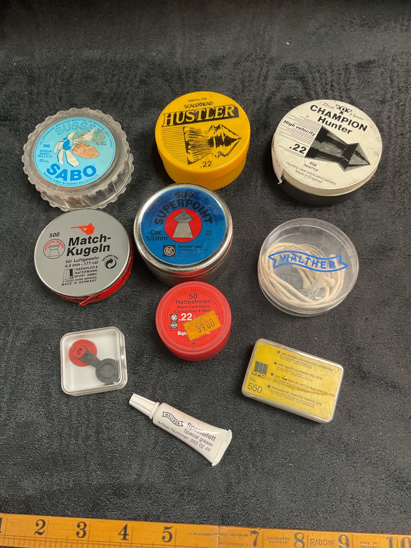 This lot comprises a selection of vintage .22 caliber air rifle pellets, presented in their original packaging. The collection includes brands such as Sabo, Hustler, and a third unmarked variety. These pellets represent a fascinating glimpse into the history of airgun shooting and target practice, showcasing packaging styles and branding from a bygone era.