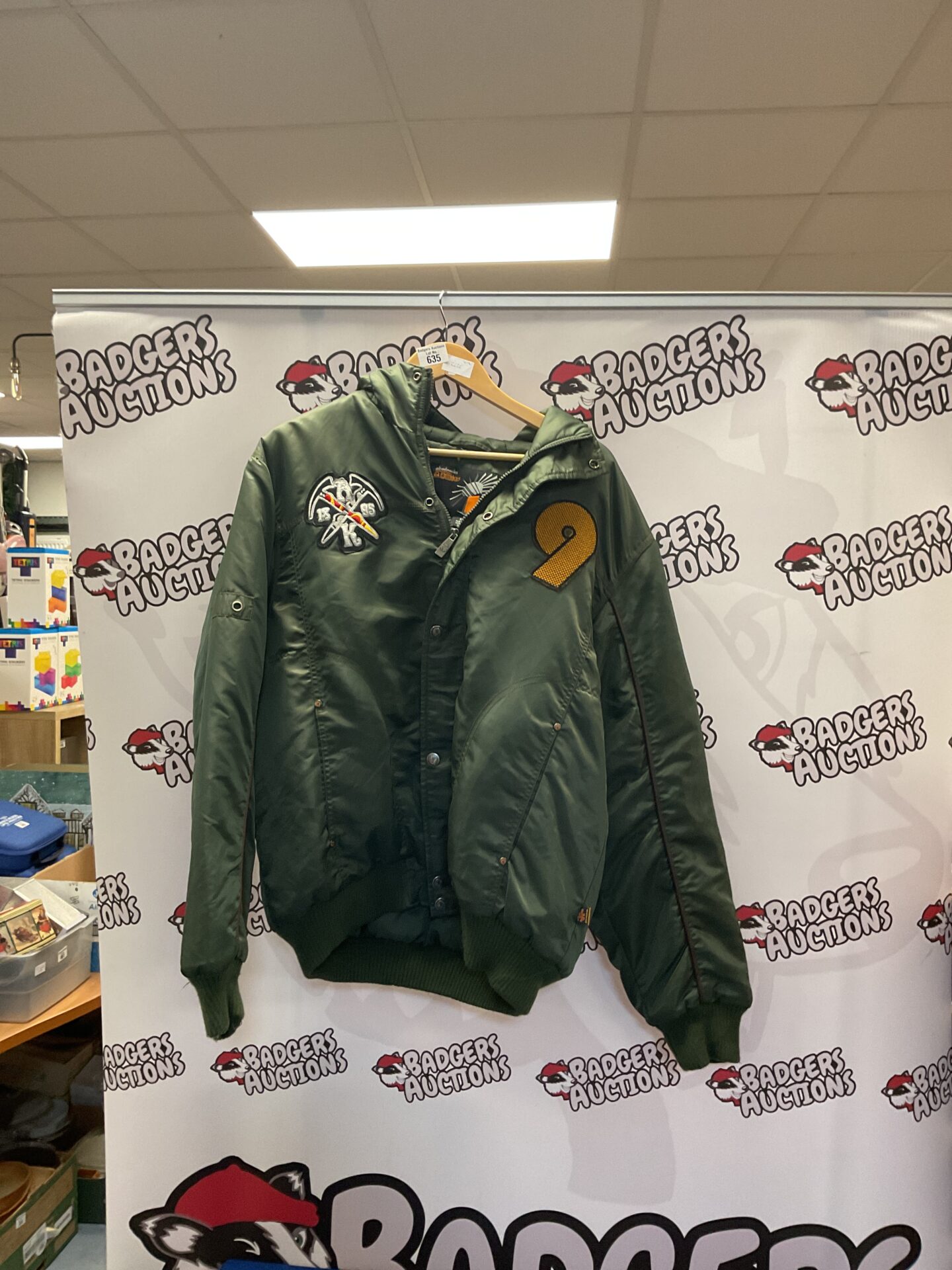 This is an Aleademiles jacket, a classic style of outerwear. The jacket features a green colour and a bomber style cut. It is a vintage piece, likely from the mid-century era, and showcases a unique design aesthetic.