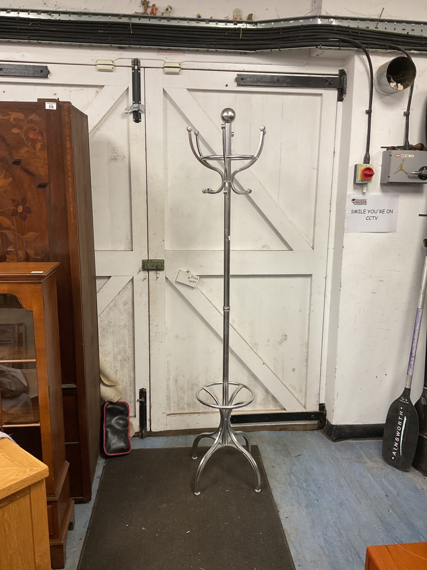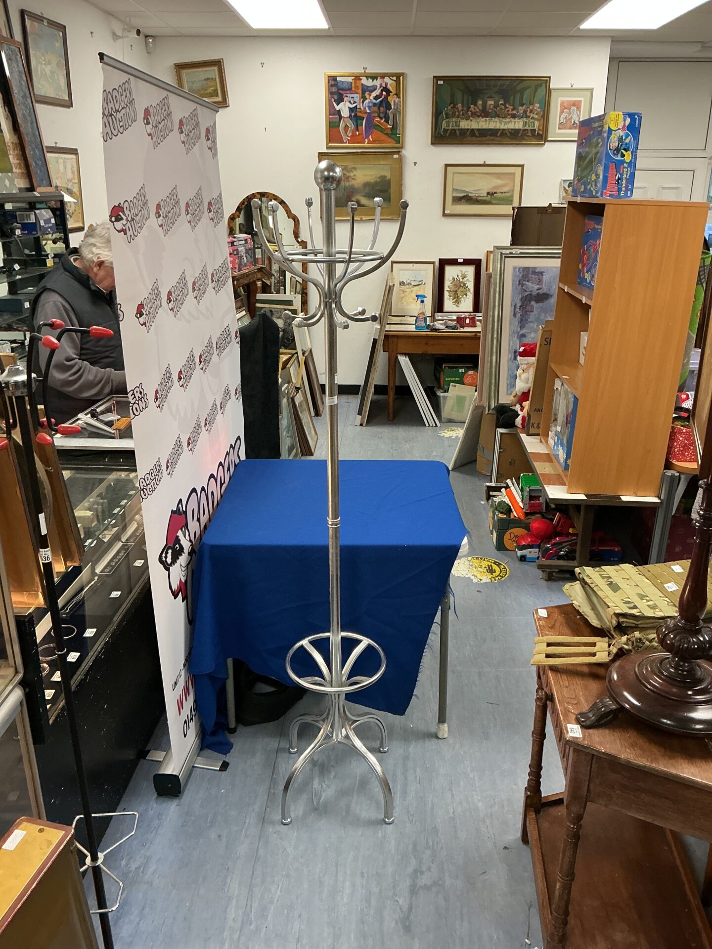 This coat and hat stand shows signs of age and use, with some minor wear and possible patina to the aluminium finish. It is offered in its original condition, and while it may benefit from cleaning or polishing, it retains its vintage charm. Collectors and buyers interested in retro decor or functional vintage pieces may find this stand a unique and appealing addition to their collection.