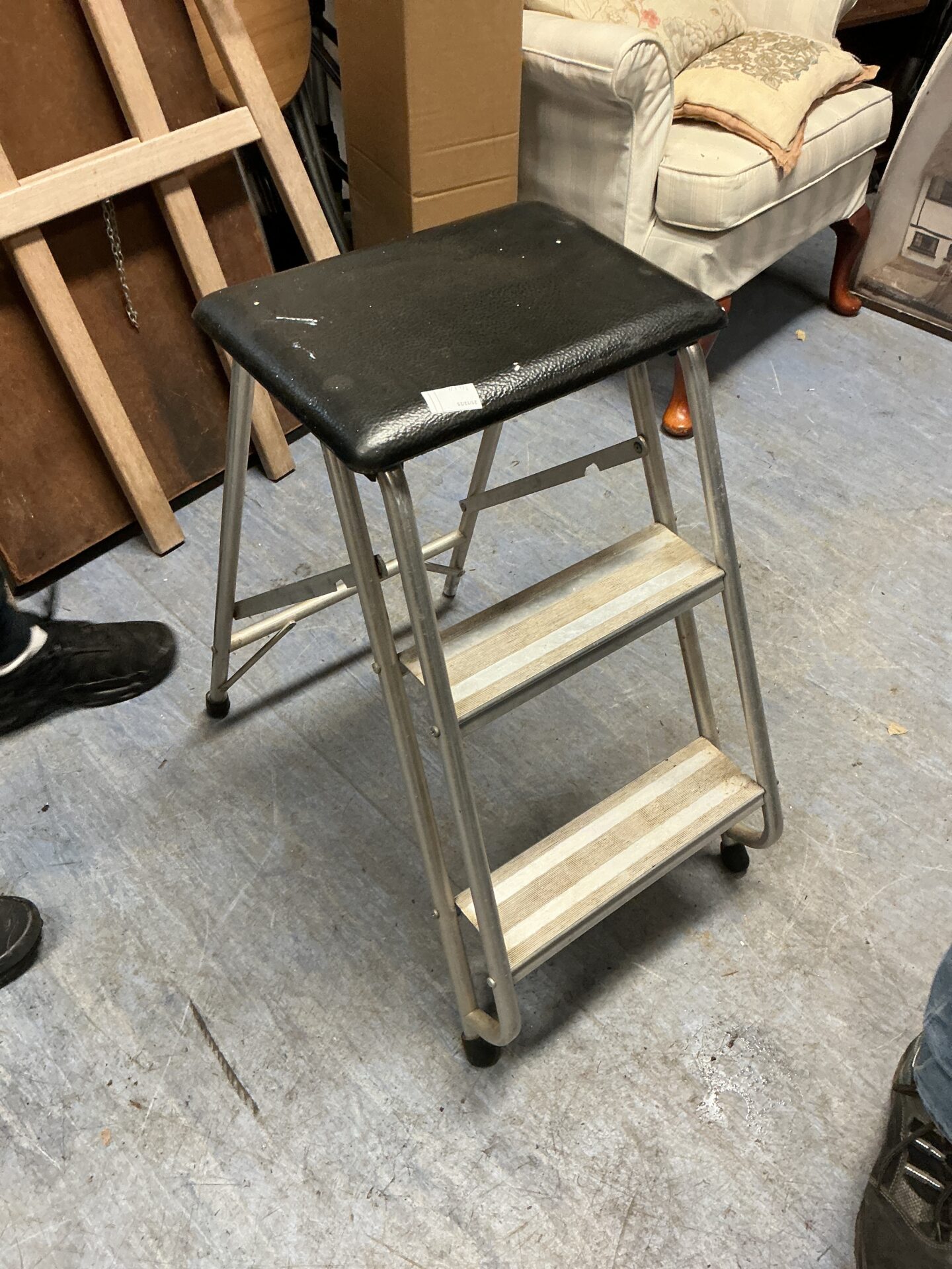 These steps show signs of previous use, with some wear and tear to the top surface. The aluminium frame appears structurally sound, but may exhibit minor blemishes. These steps would appeal to buyers seeking a functional item for household tasks, or those interested in vintage kitchenalia.