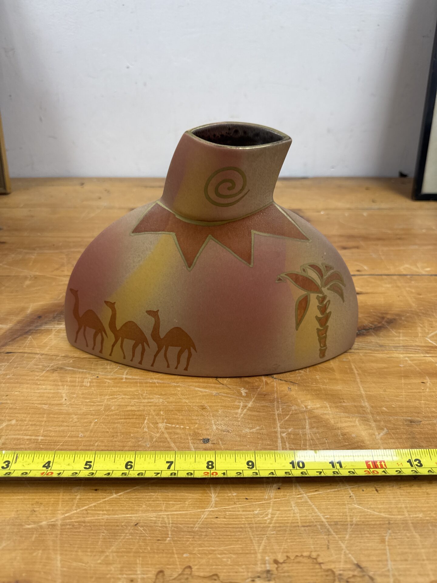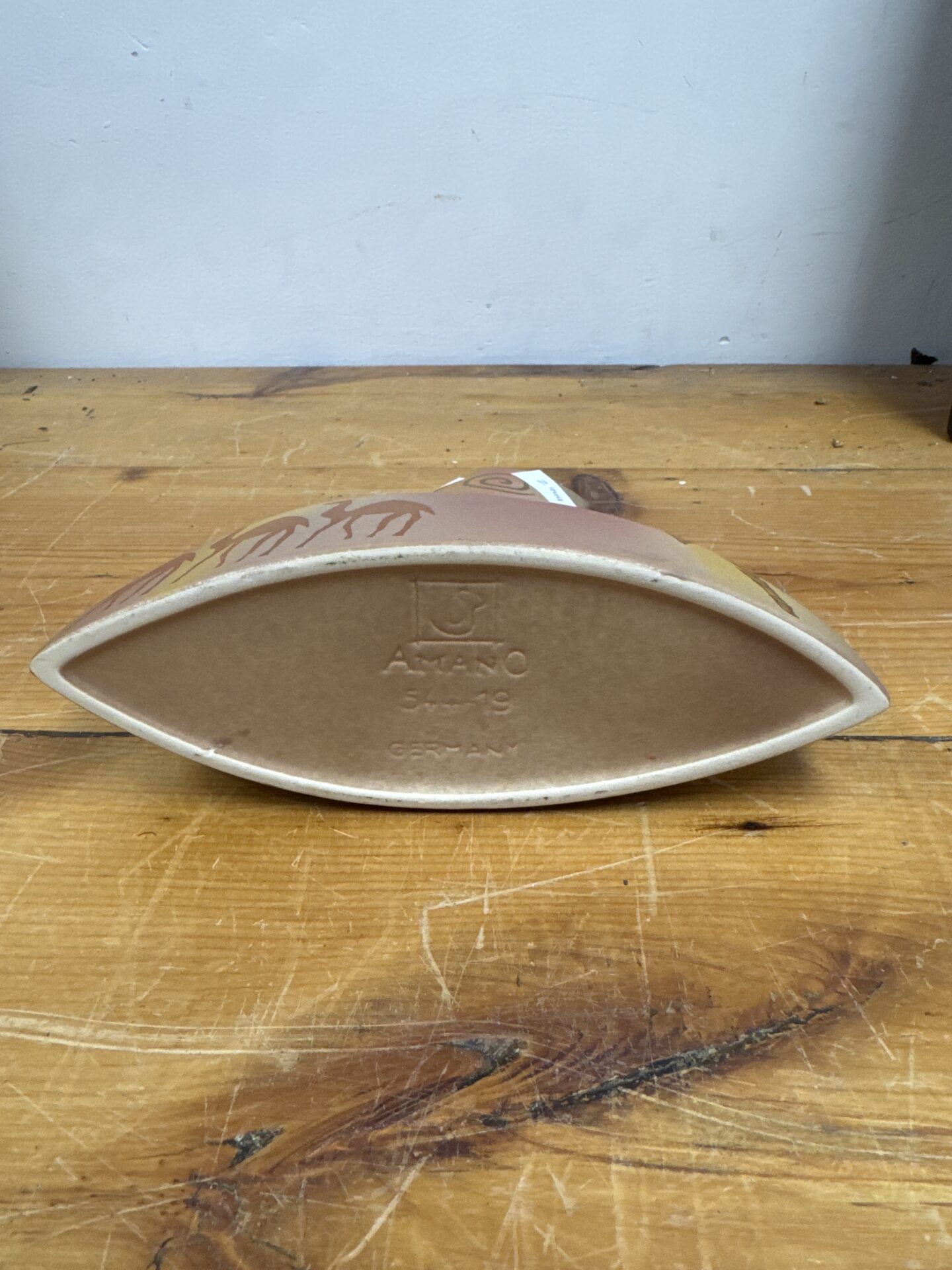 This striking vase is a beautiful example of German Amano pottery, specifically model number 544-19. The vase features a warm, earthy tone and is adorned with a repeating motif of camels in various poses. The design evokes a sense of travel and adventure, and the vase’s unique shape and artistic detailing make it a standout piece for any collection or home décor setting.