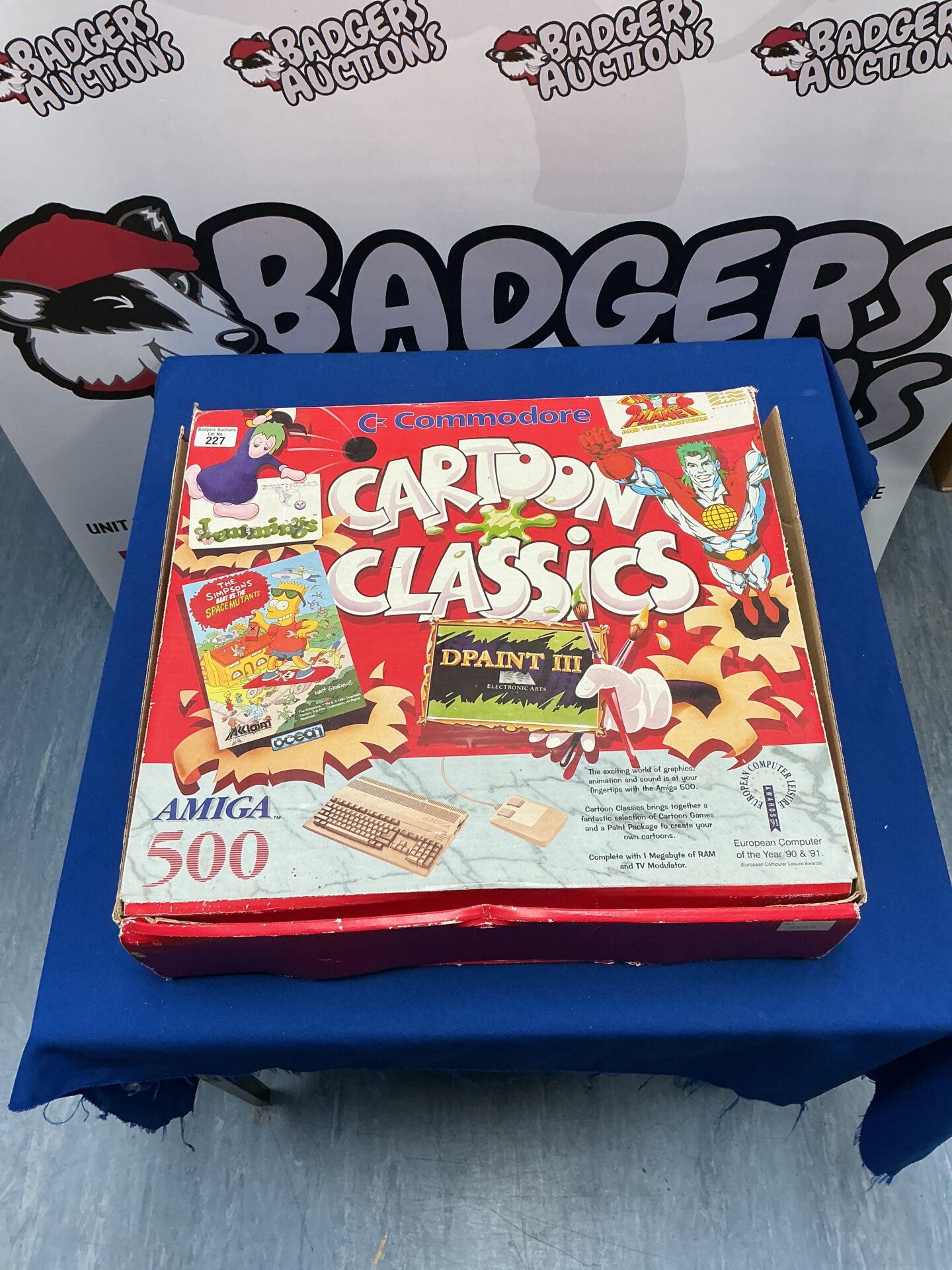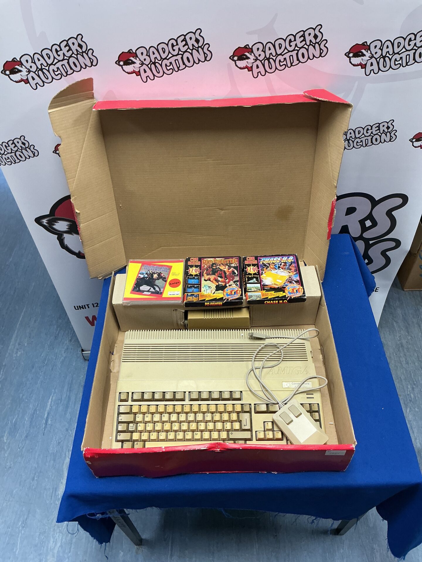 The computer and accessories are presented as viewed in the images. This lot may be of interest to collectors of retro computing, fans of the Amiga platform, or those seeking a nostalgic gaming experience. The inclusion of game cartridges adds to its appeal for those interested in playing classic Amiga titles.