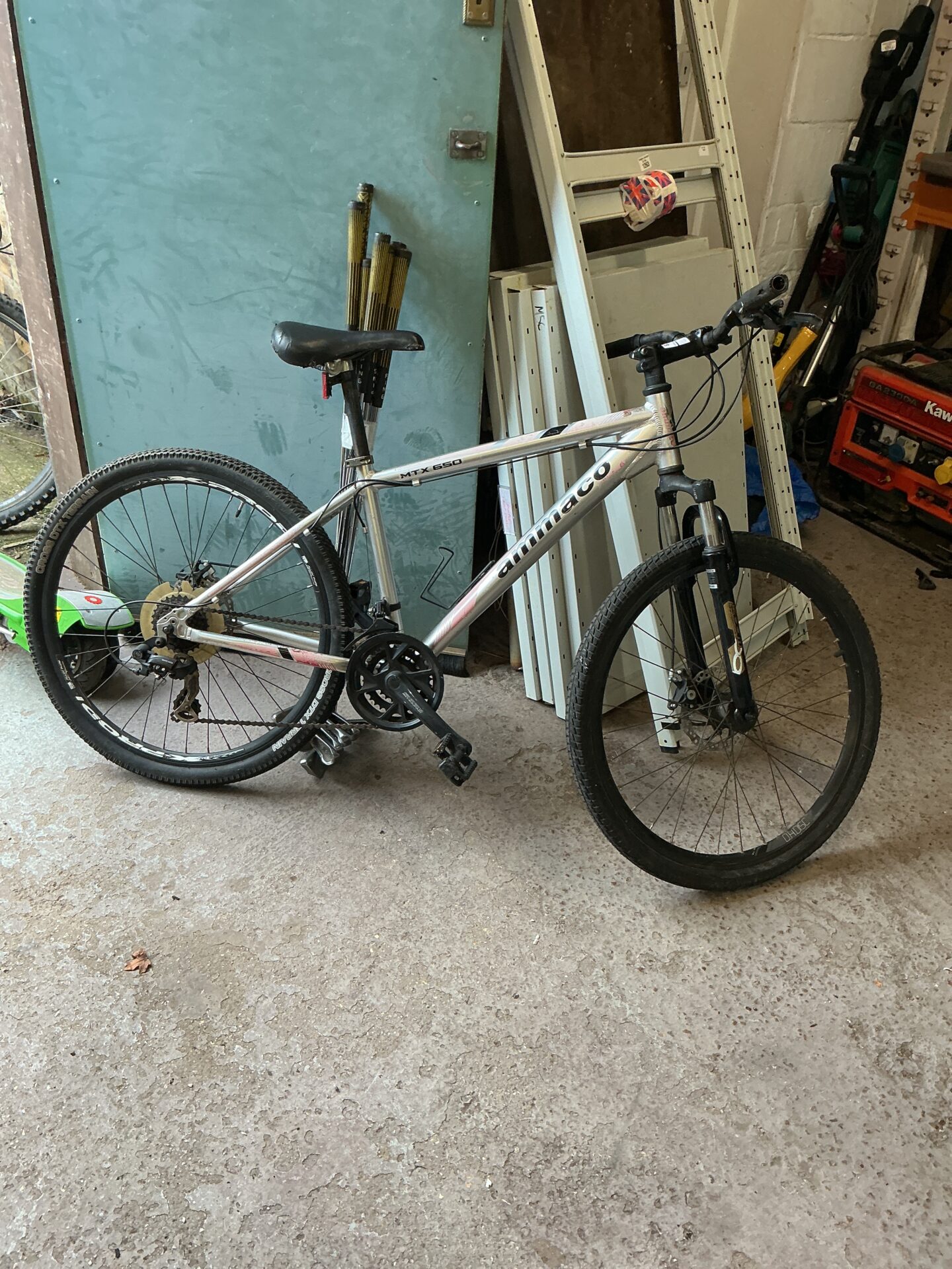 This is an Ammeco mxt mountain bike, designed for off-road cycling and outdoor adventures. It features a sturdy frame, front suspension for absorbing bumps, and tires designed for traction on various terrains. The bike appears to be a standard hardtail mountain bike configuration, suitable for recreational riding and exploring trails.