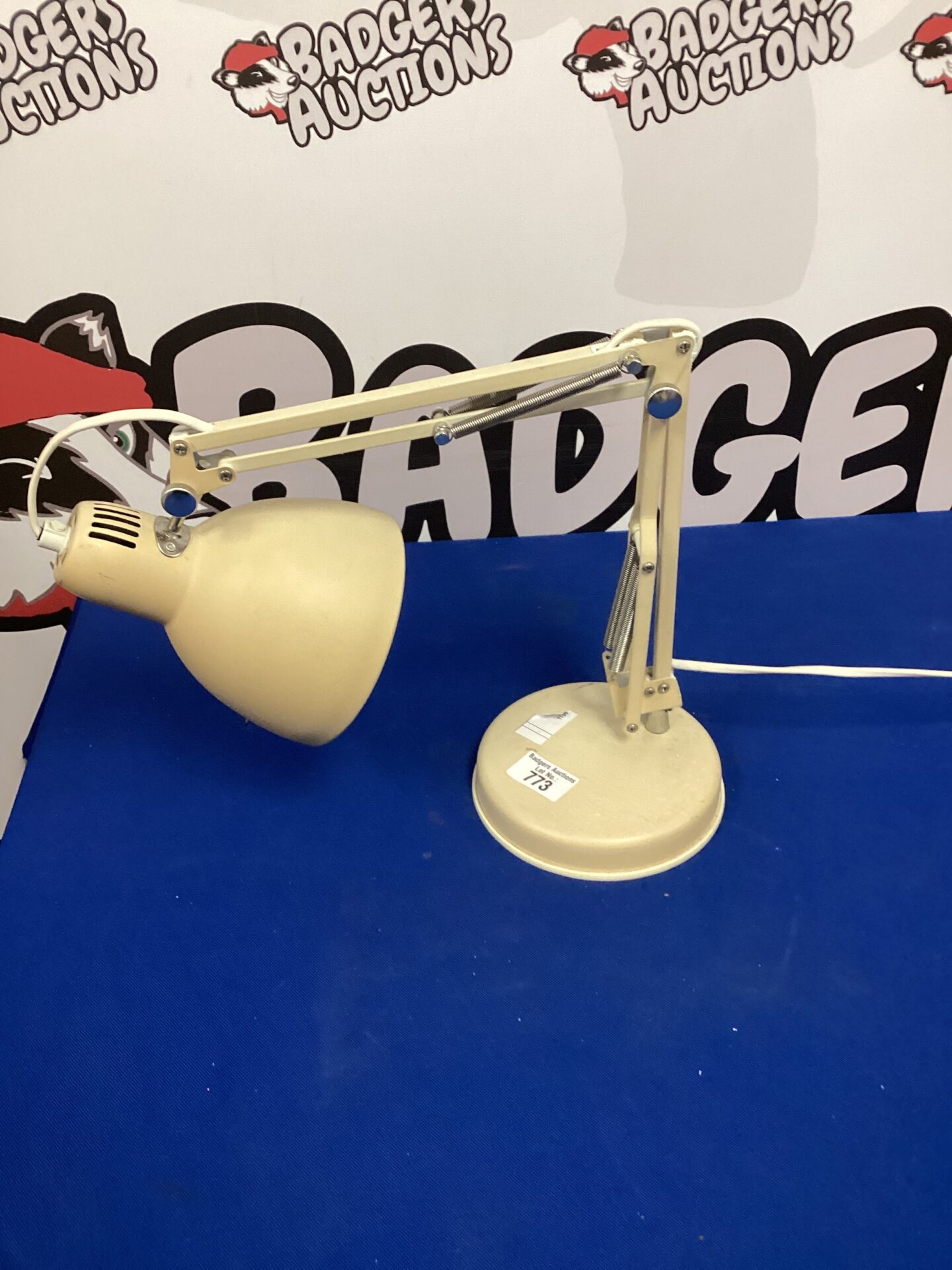 This is an Anglepoise style desk lamp, reminiscent of the iconic designs from the mid-20th century. Featuring a classic adjustable arm and a circular base, this lamp offers directional lighting ideal for desks, workbenches, or reading nooks. The lamp’s design allows for versatile positioning, making it a practical and stylish addition to any space.