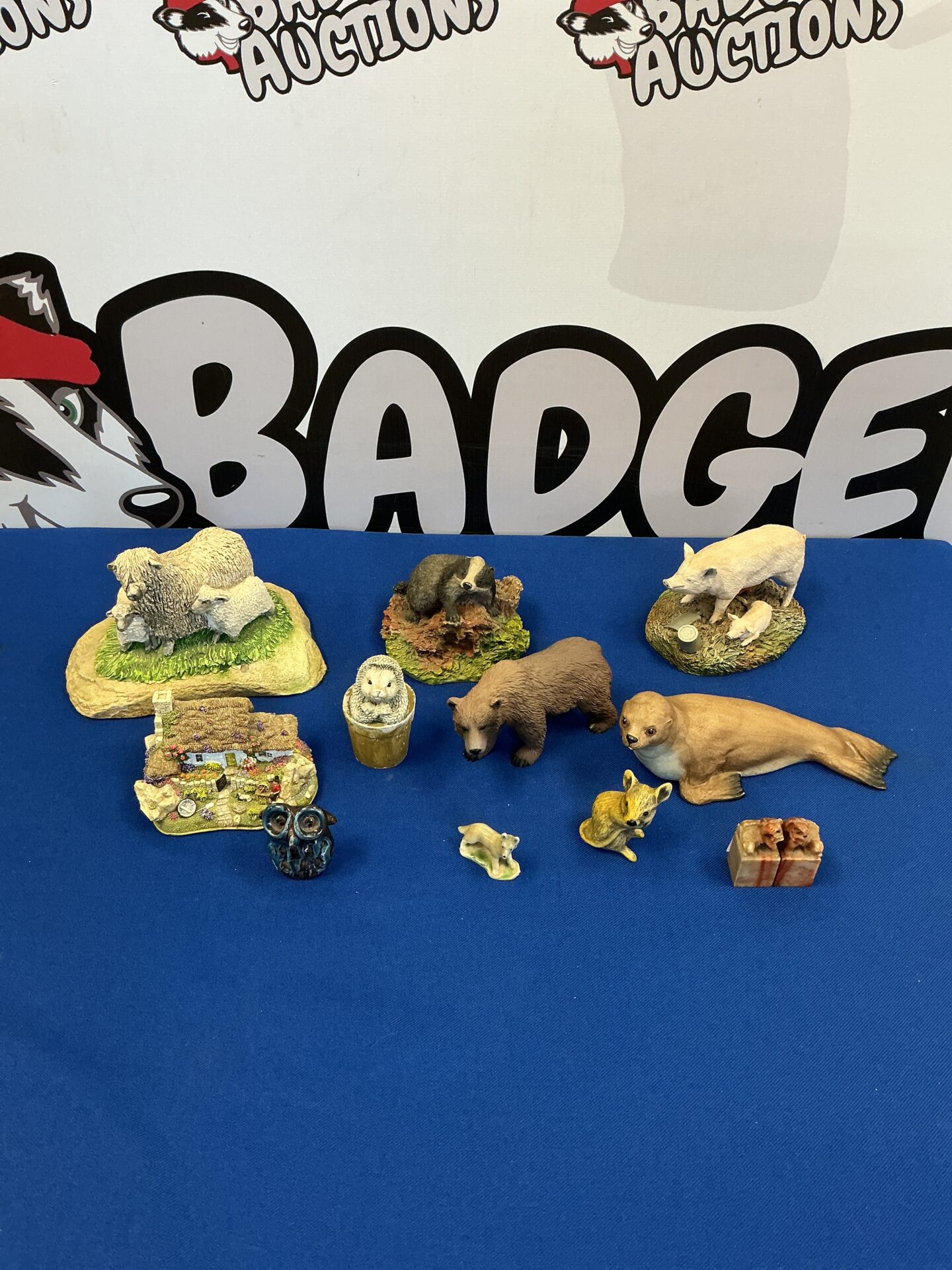 This charming collection features a variety of meticulously crafted animal figurines, including a beautifully hand-painted badger. The figurines depict various wildlife, showcasing detailed sculpting and a rustic aesthetic. These pieces would add a touch of countryside charm to any home or collection, and are ideal for animal lovers and collectors alike.