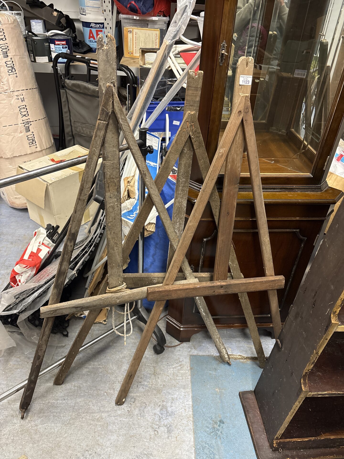 These easels exhibit signs of age and use, with wear and patina consistent with their antique status. While showing signs of use, they retain a charming character that appeals to collectors of art equipment and vintage studio items. These easels would be ideal for restoration projects, display pieces, or for use by artists seeking a traditional painting experience.