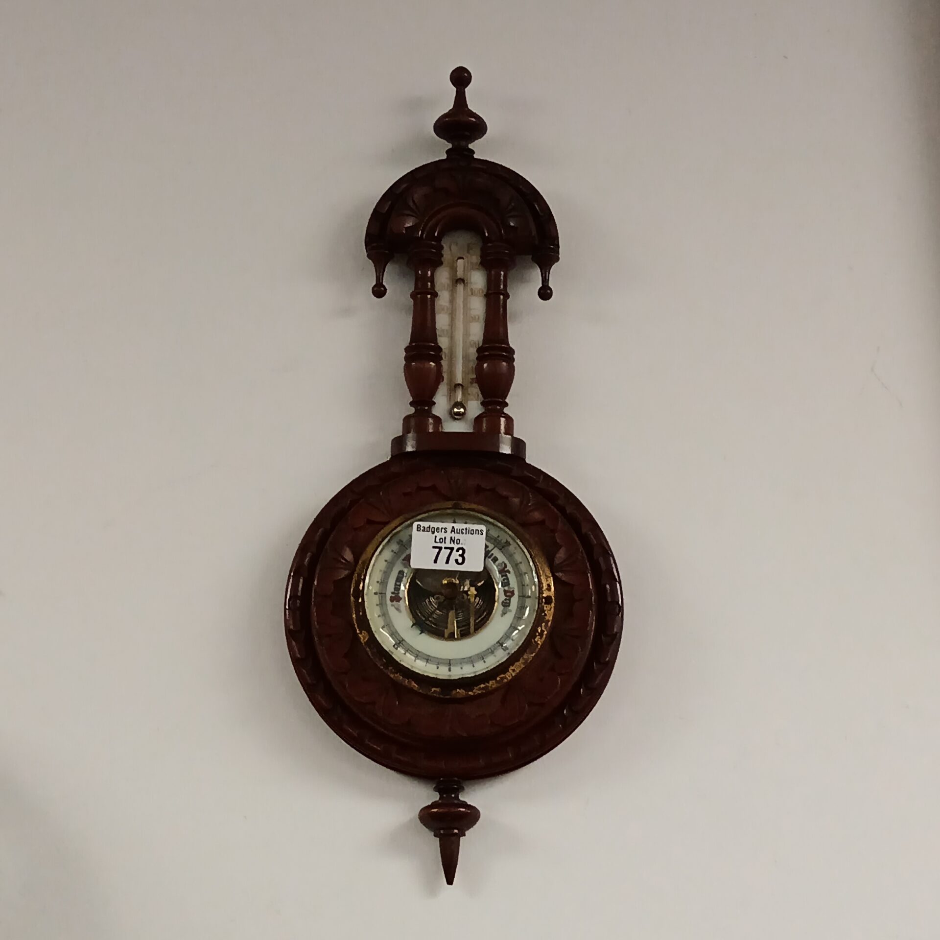 This antique barometer features an oak case, typical of those produced during the Victorian era. The circular dial displays barometric pressure, with a Fahrenheit thermometer incorporated into the design. The barometer’s construction suggests it was intended for both practical use and as a decorative element in a home or nautical setting.