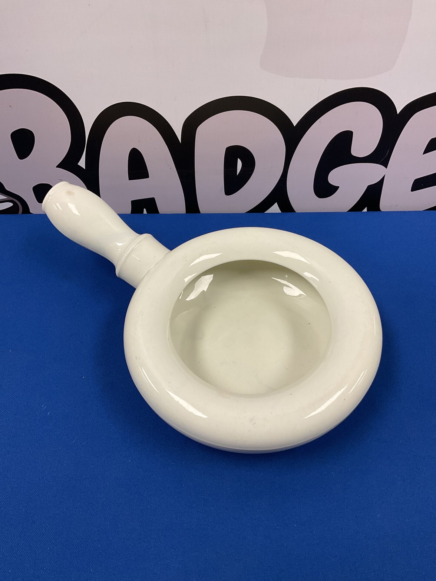 This is an antique ceramic bed pan, likely dating from the early to mid 20th century. The pan is constructed from white ceramic, exhibiting a simple, functional design typical of hospital and medical equipment of the period. Its curved shape and handle were designed for ease of use and hygiene, reflecting the standards of care at the time.