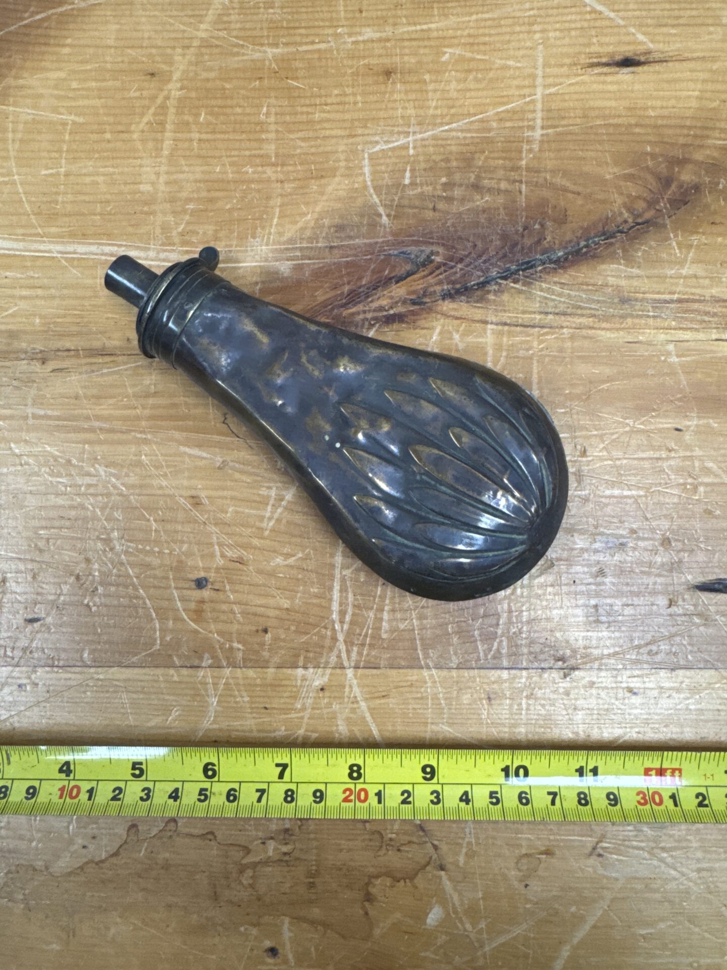 The flask is in good antique condition, showing expected wear consistent with age and use. There are no significant cracks or damage, and the nozzle is intact and functional. This piece would be a valuable addition to a collection of antique firearms accessories or a fascinating display item for enthusiasts of historical weaponry. Its well-preserved condition and classic design make it a desirable piece for collectors and history buffs alike.