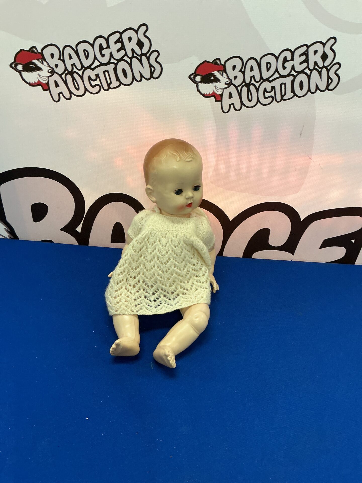 This is an antique child’s doll, likely dating from the mid-20th century. The doll features a composition head and body, with painted facial features and mohair hair. It is dressed in a delicate white lace dress, suggesting a special occasion or heirloom piece. The doll’s construction and style are typical of those produced during this era, intended to be cherished companions for children.